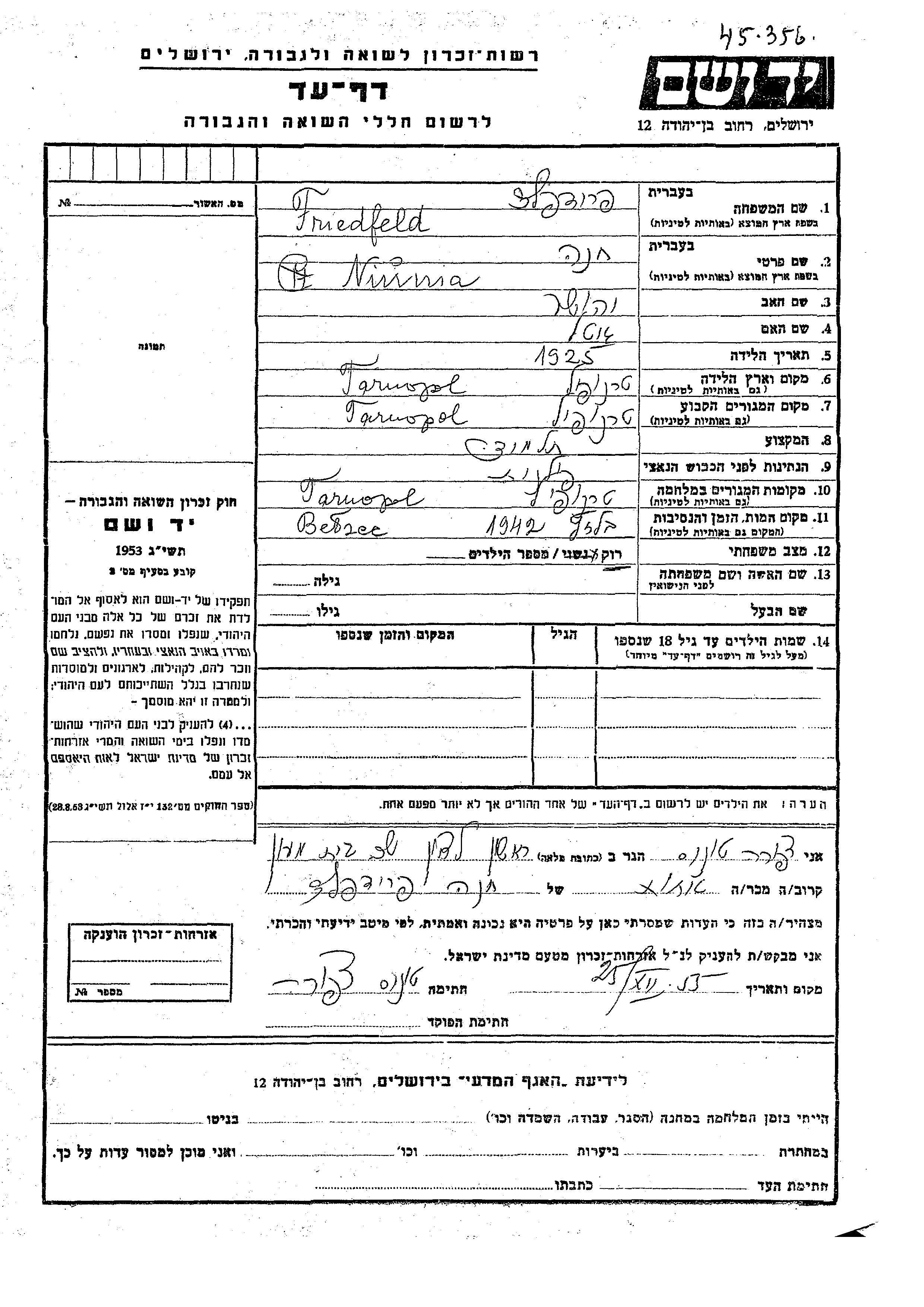 Friedfeld Niunia Khana 1925 Tarnopol, Poland Page of Testimony