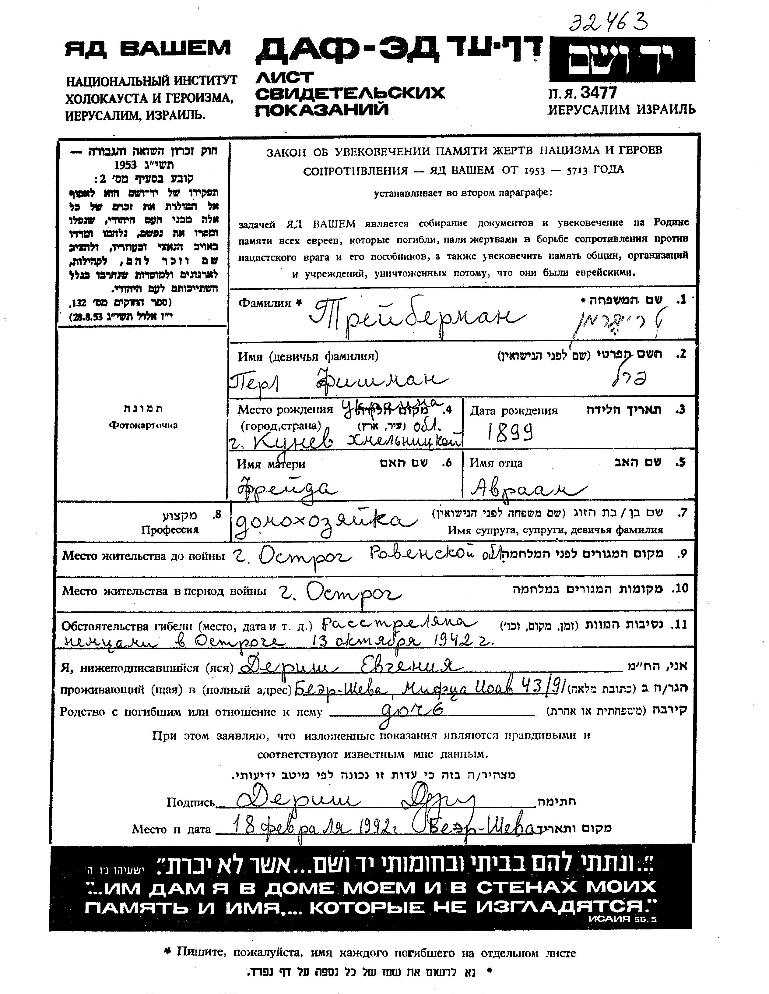 | Treiberman | Perl | 1899 | Ostrog, Poland | Page of Testimony |