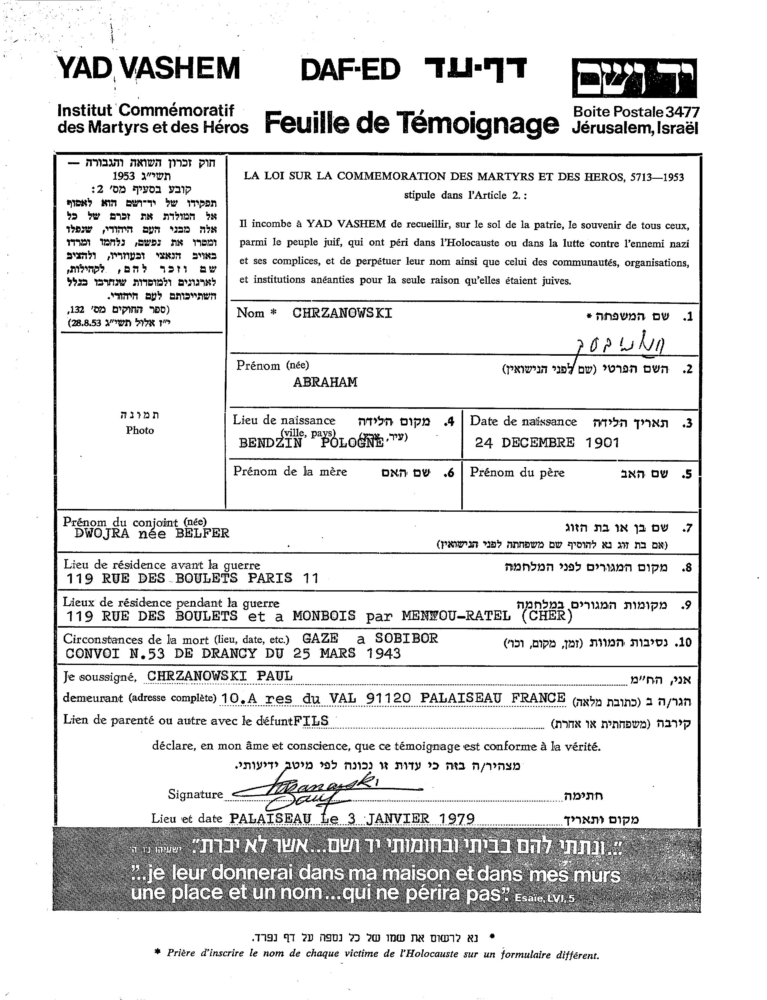 Chrzanowski Abraham 1901 Paris, France Page of Testimony
