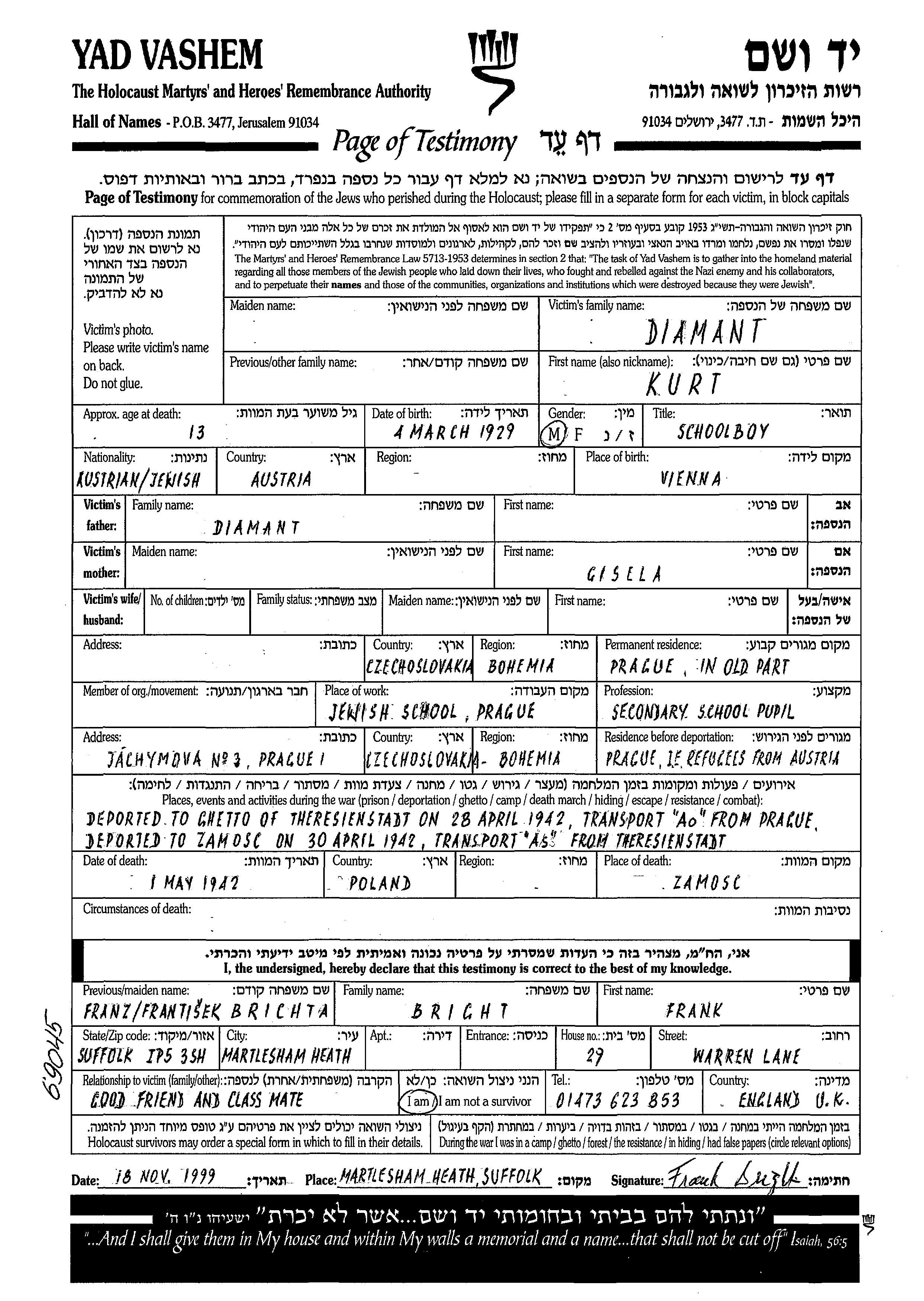Diamant Kurt 1929 Prague, Czechoslovakia Page of Testimony