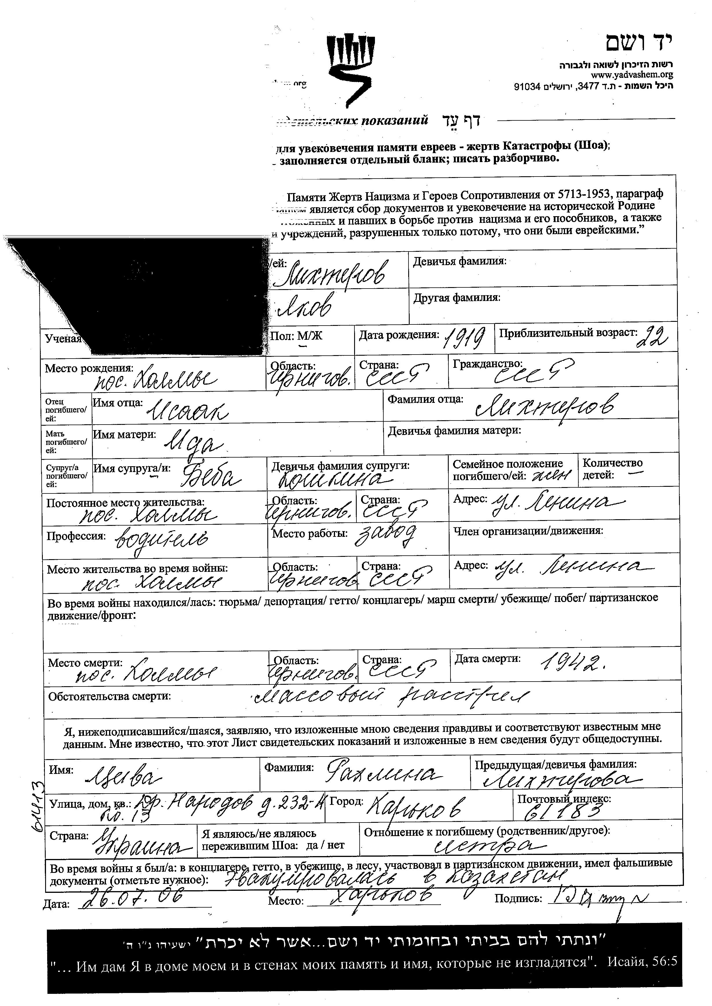 Yakov Likhterov was born in Kholmy, Ukraine (USSR), 1919. He was a driver. Prior to WWII he lived in Kholmy, Ukraine (USSR). Yakov was murdered in the Shoah. Place of death: Kholmy, Ukraine (USSR), 1942.