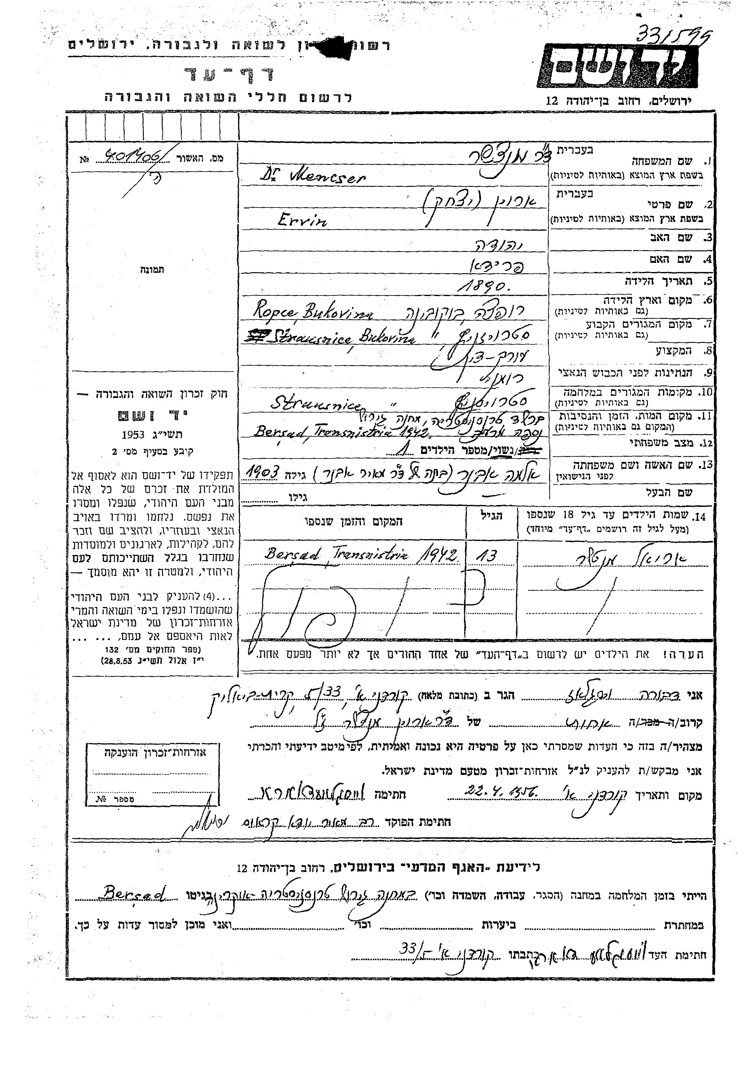 Mencser | Ervin Yitzkhak | 1890 | Strojinetz, Romania | Page of Testimony |