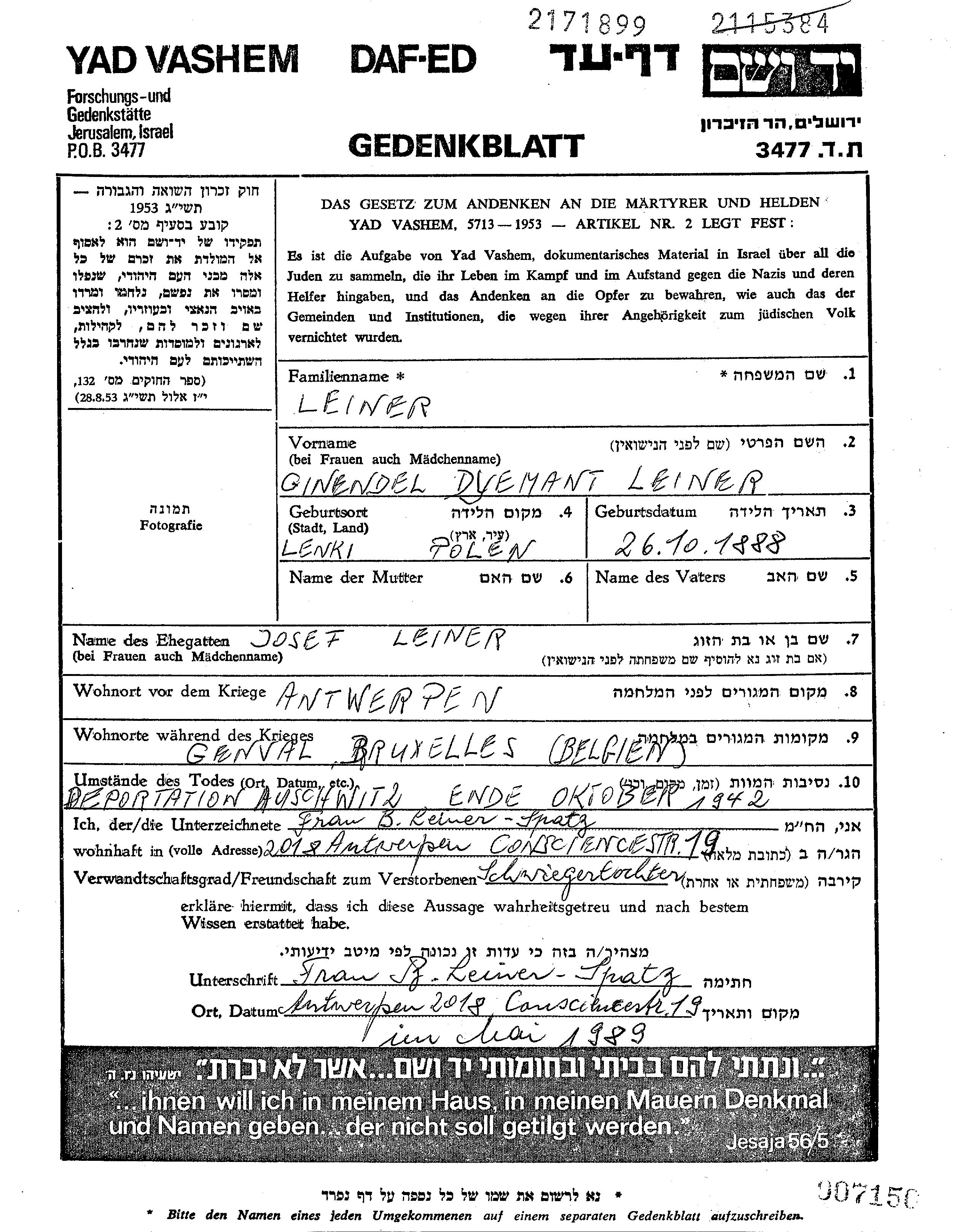 Genendl Leiner nee Dyemant was born in Lenki, Poland, 1888. She was a housewife. Prior to WWII she lived in Antwerpen, Belgium. Genendl was murdered in the Shoah. Place of death: Auschwitz, Poland.