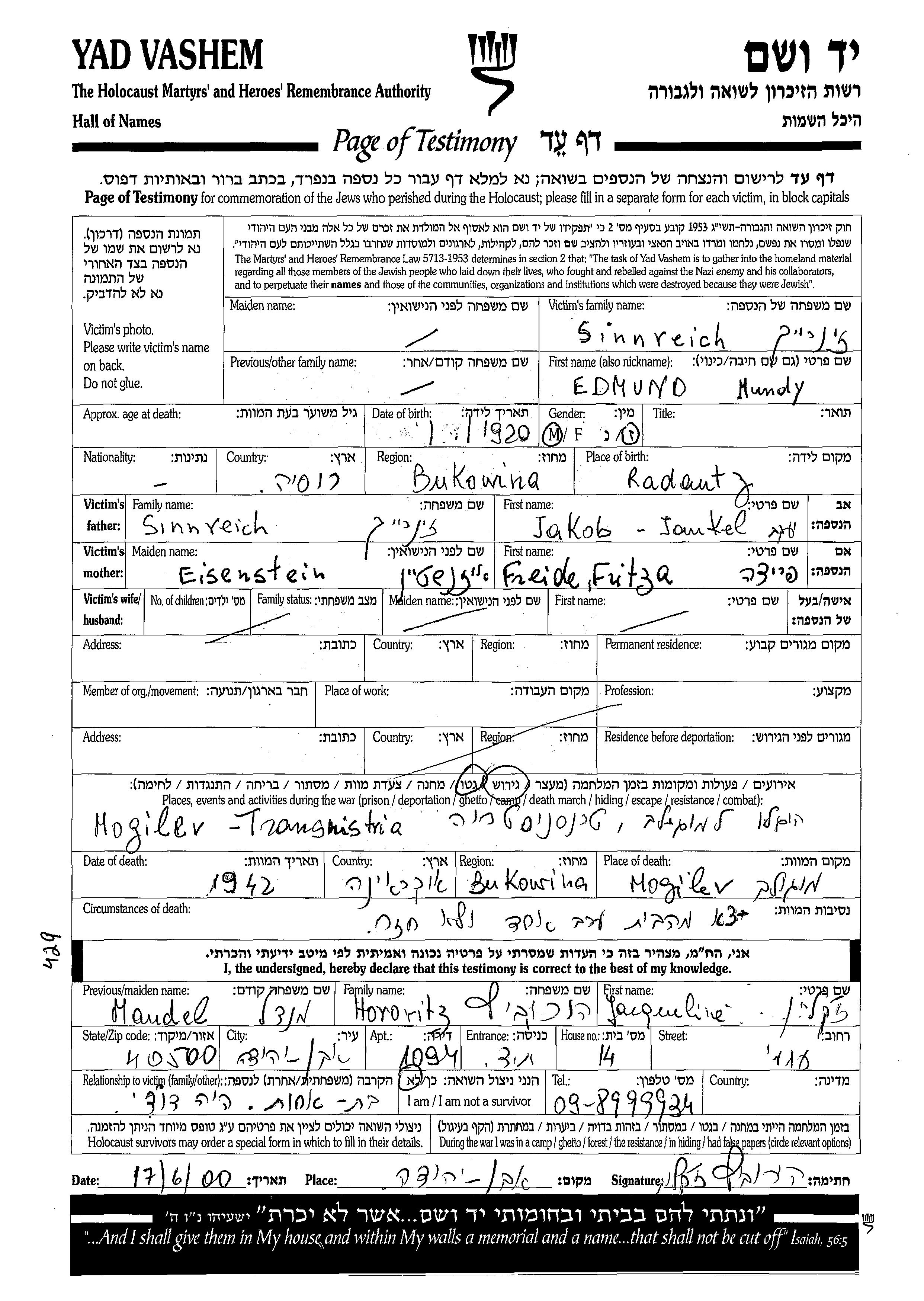 Sinnreich Edmund 1920 unstated place, Page of Testimony