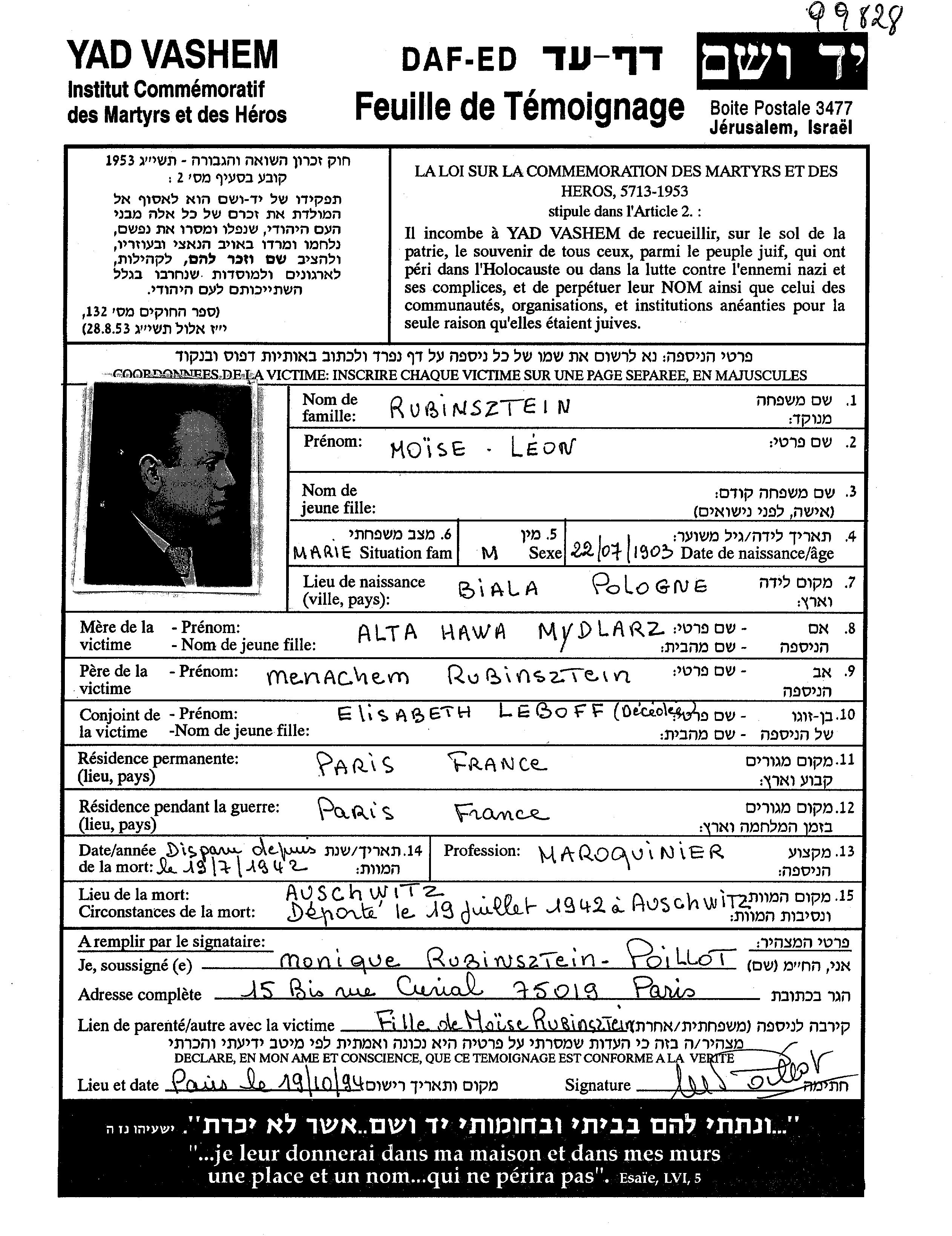 Rubinsztein Moise Leon 1903 Paris, France Page of Testimony