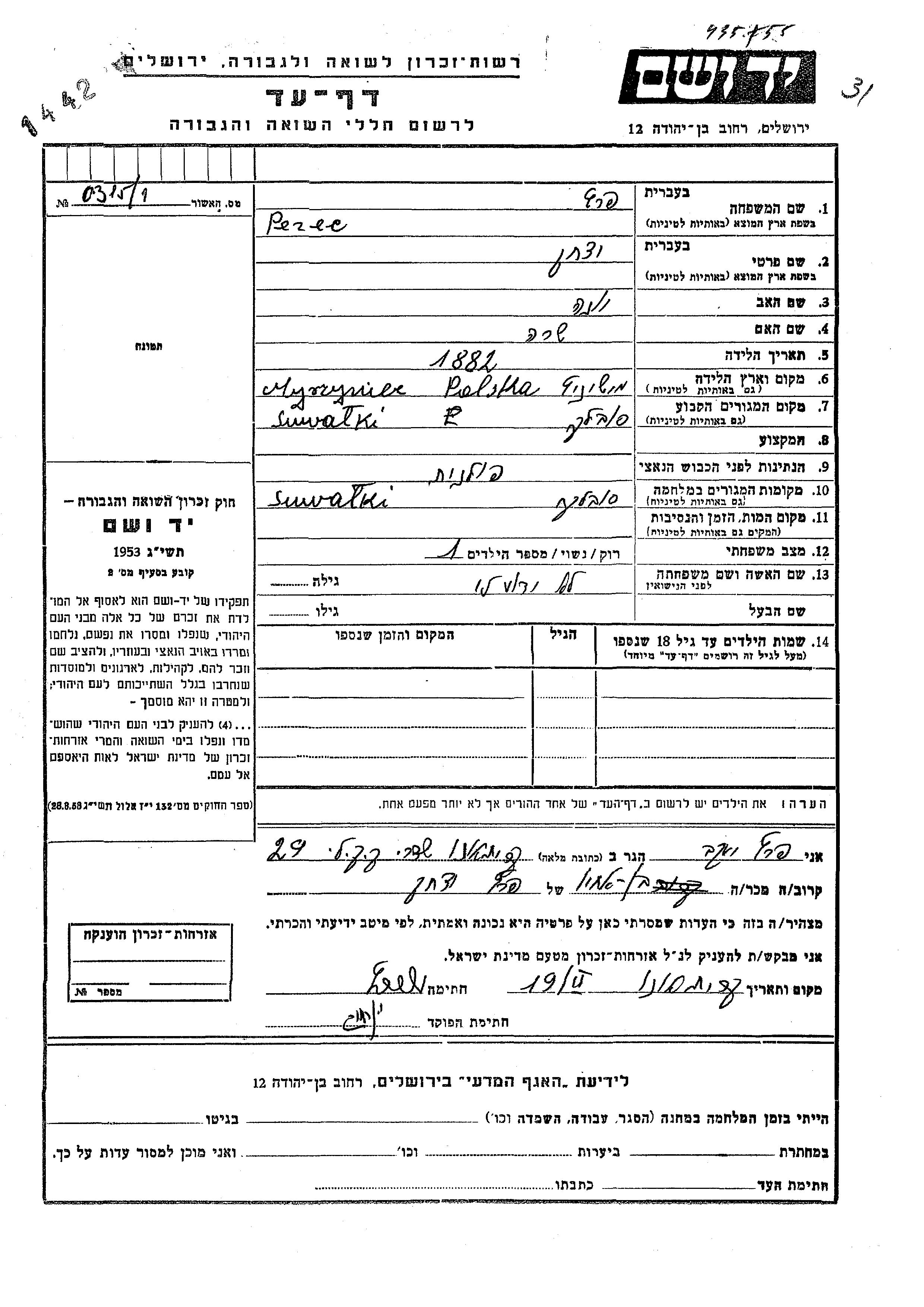 Perec | Yitzkhak | 1882 | Suwalki, Poland | Page of Testimony |
