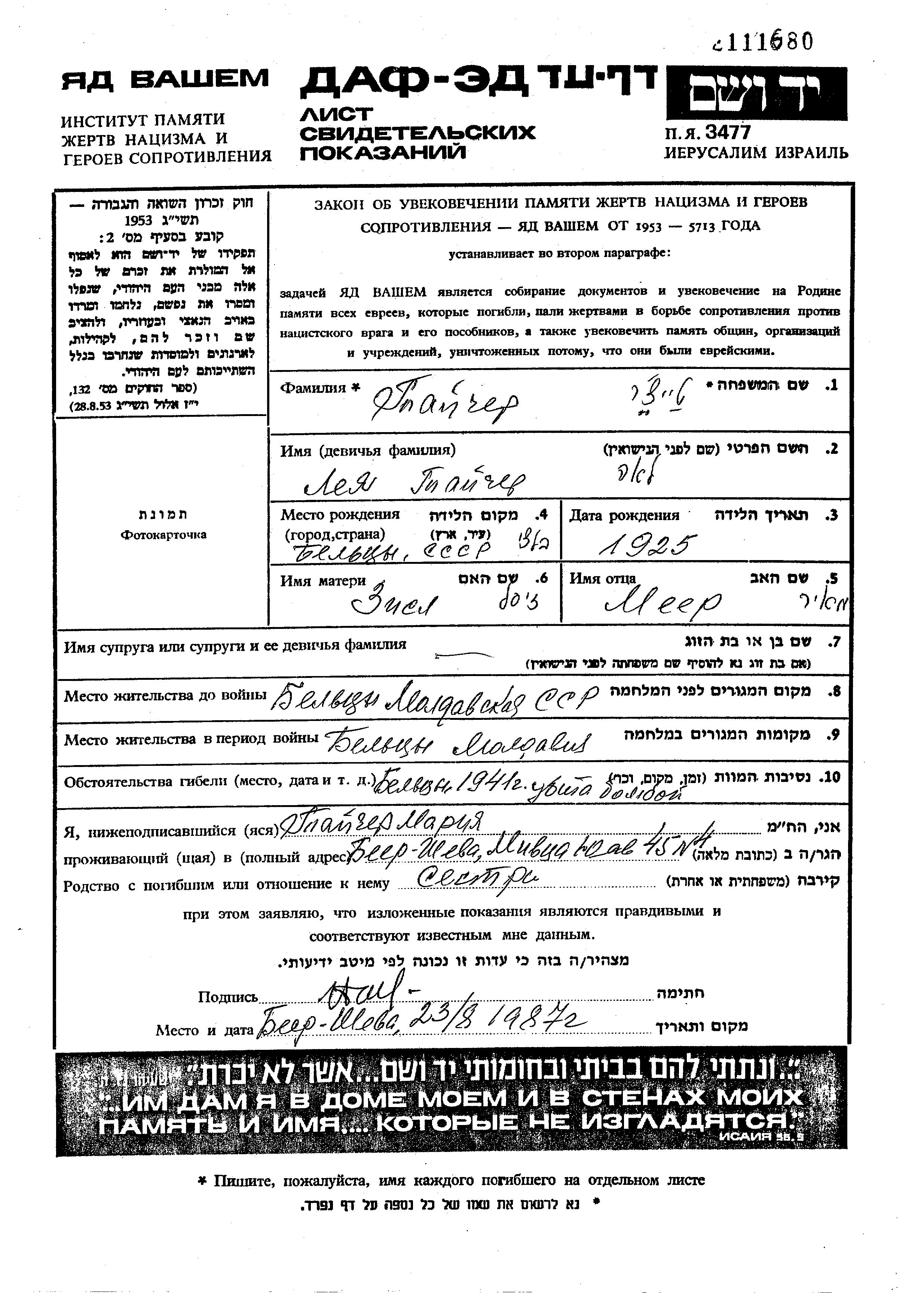 | Tajcher Teicher | Lea | 1925 | Beltz, Romania | Page of Testimony |