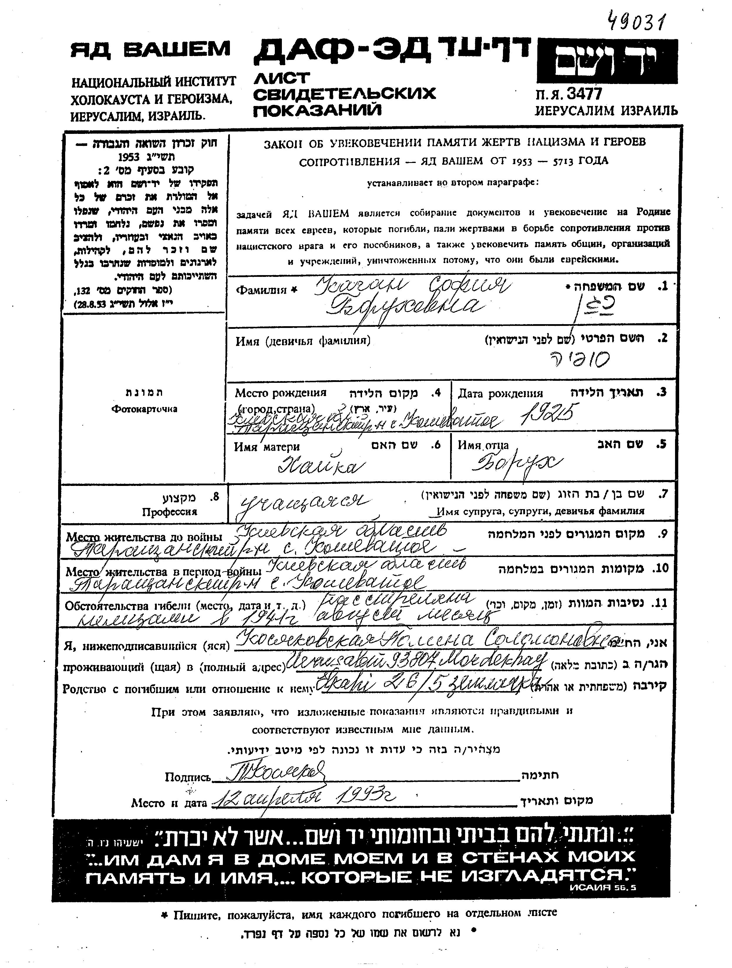 Kagan | Sofya | 1925 | Koshevatoye, Ukraine (USSR) | Page of Testimony |
