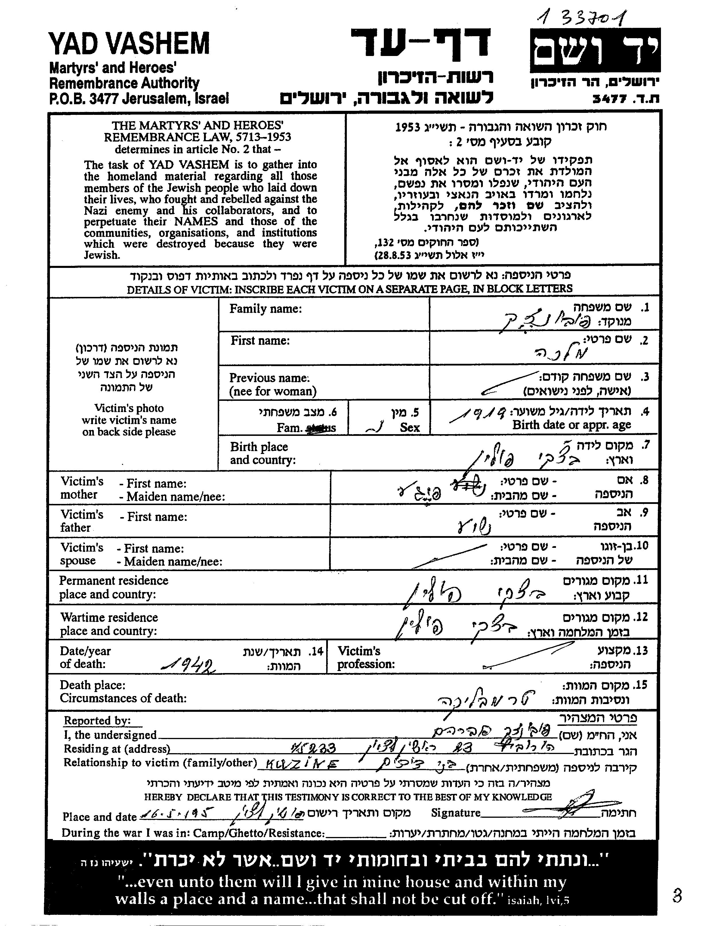 Yad Vashem - Pages of Testimony Names Memorial Collection