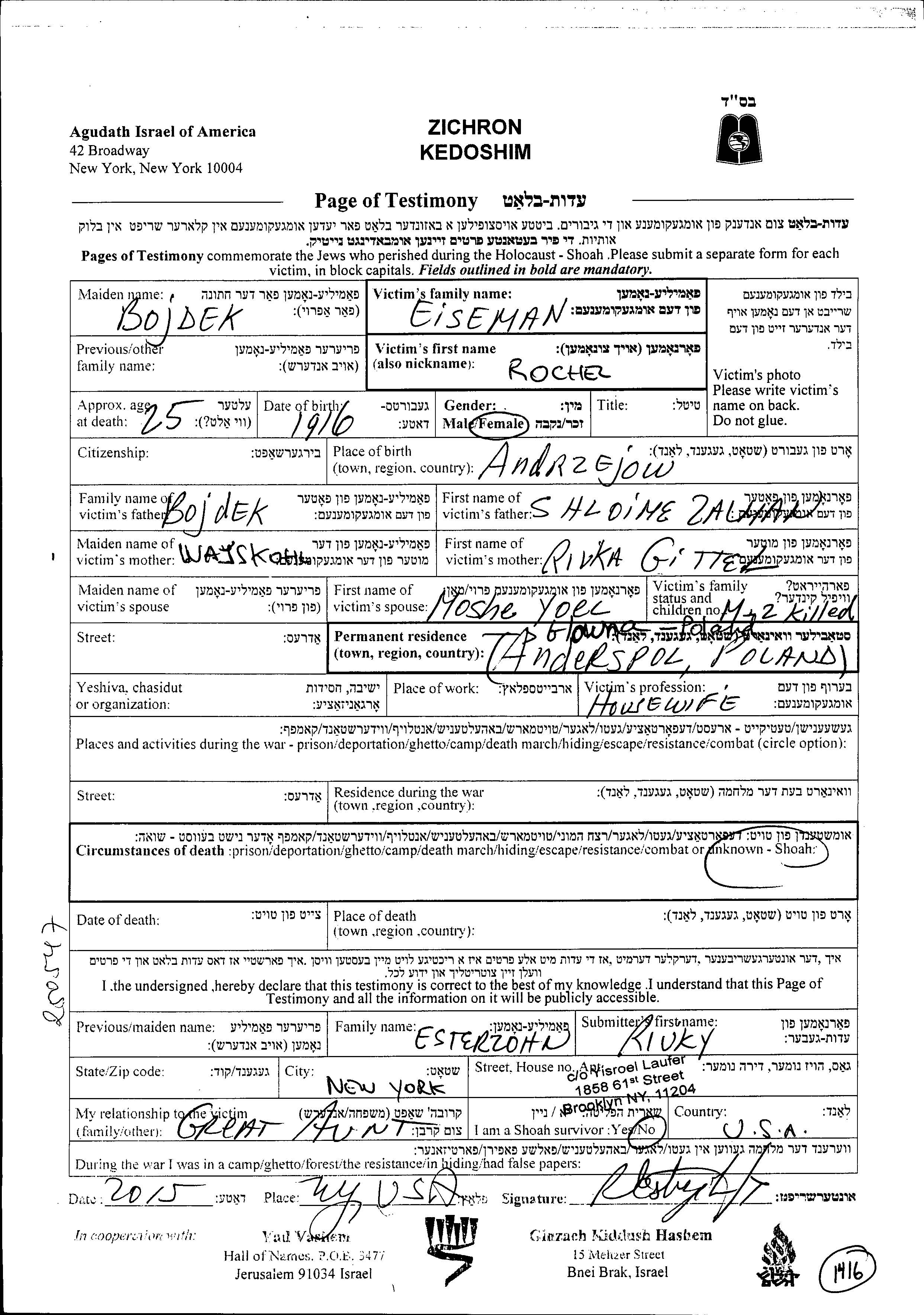 Eiseman Rochel 1916 Andrespol, Poland Page of Testimony