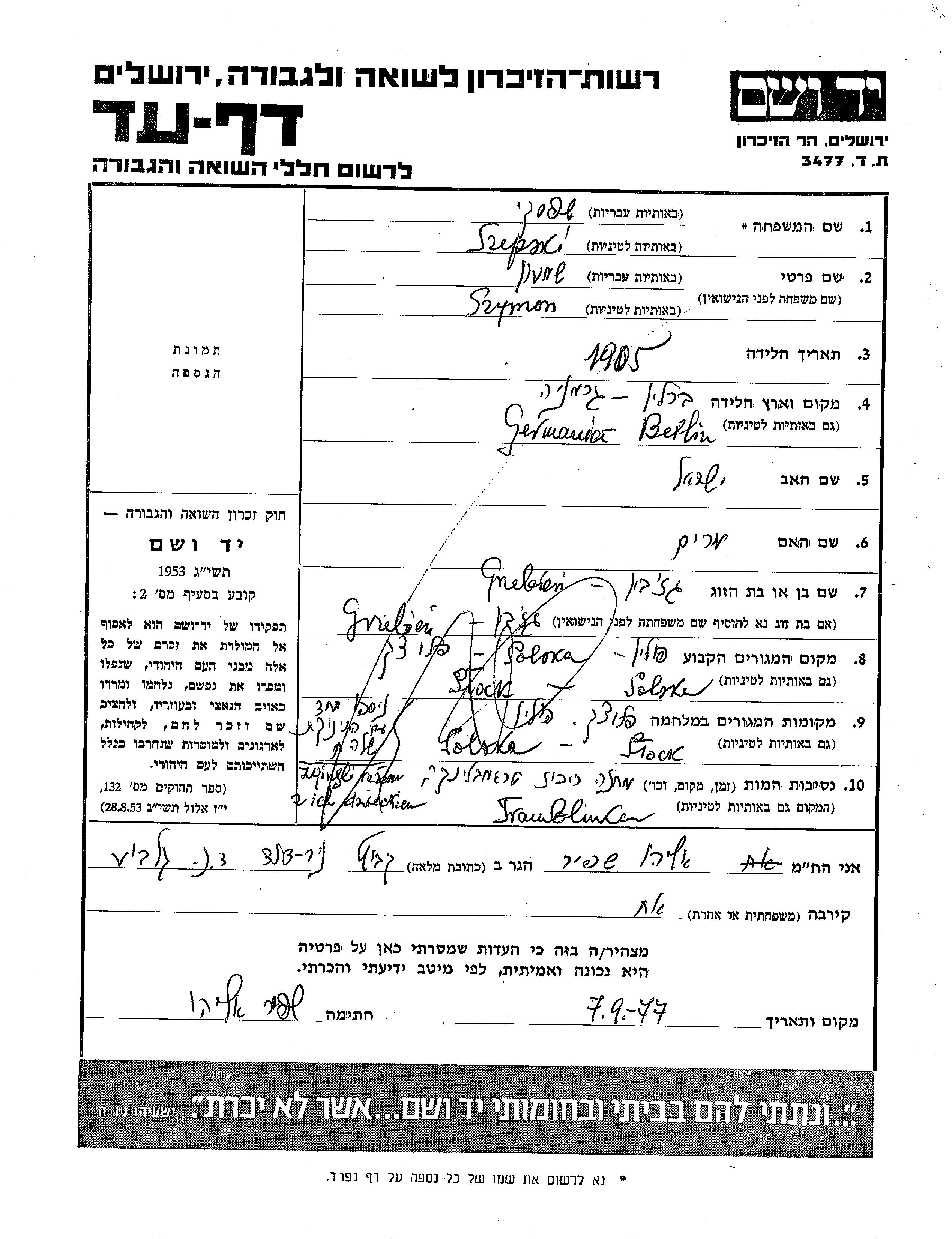 | Szepski | Symon | 1905 | Plock, Poland | Page of Testimony |