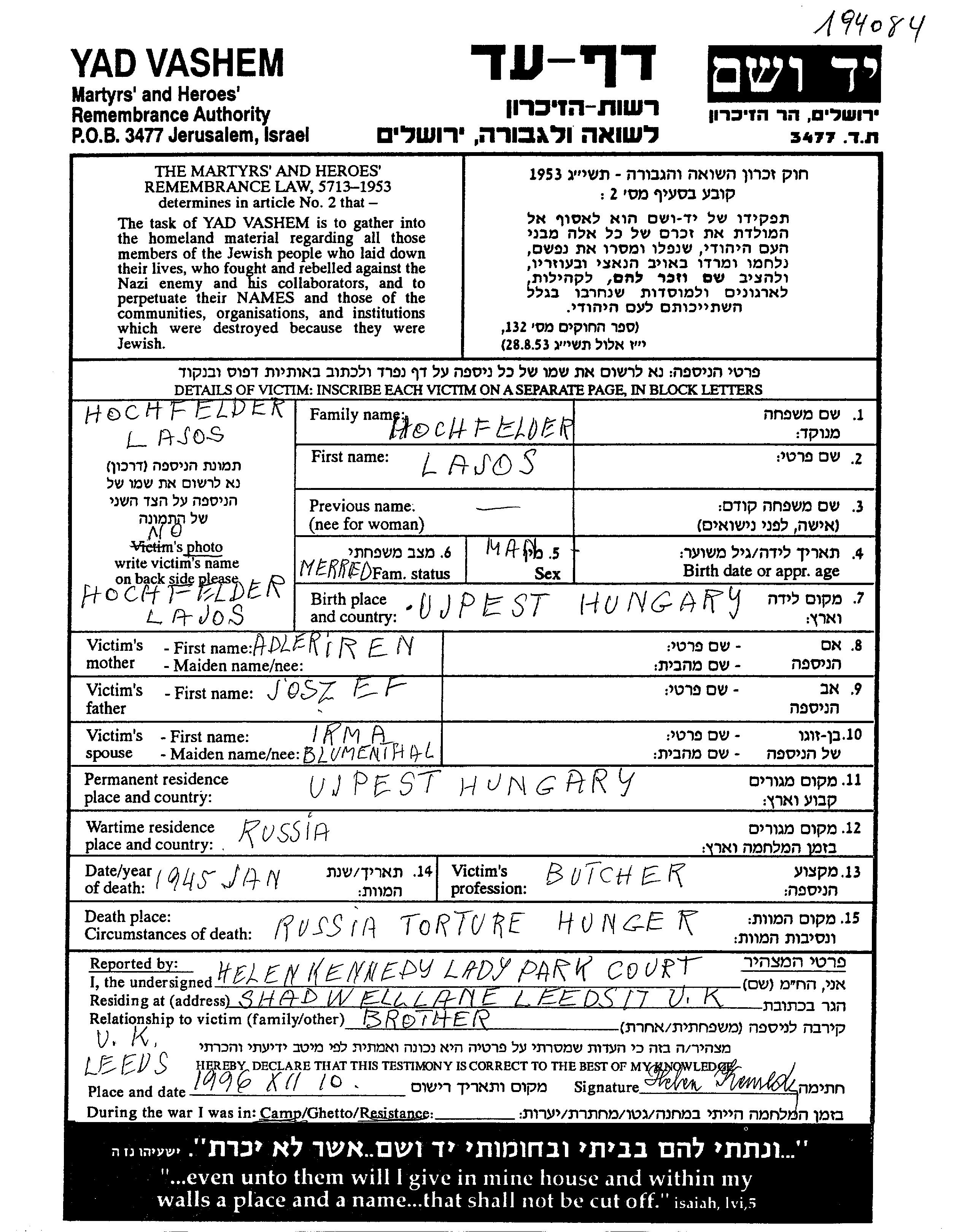 Hochfelder Lajos Ujpest, Hungary Page of Testimony