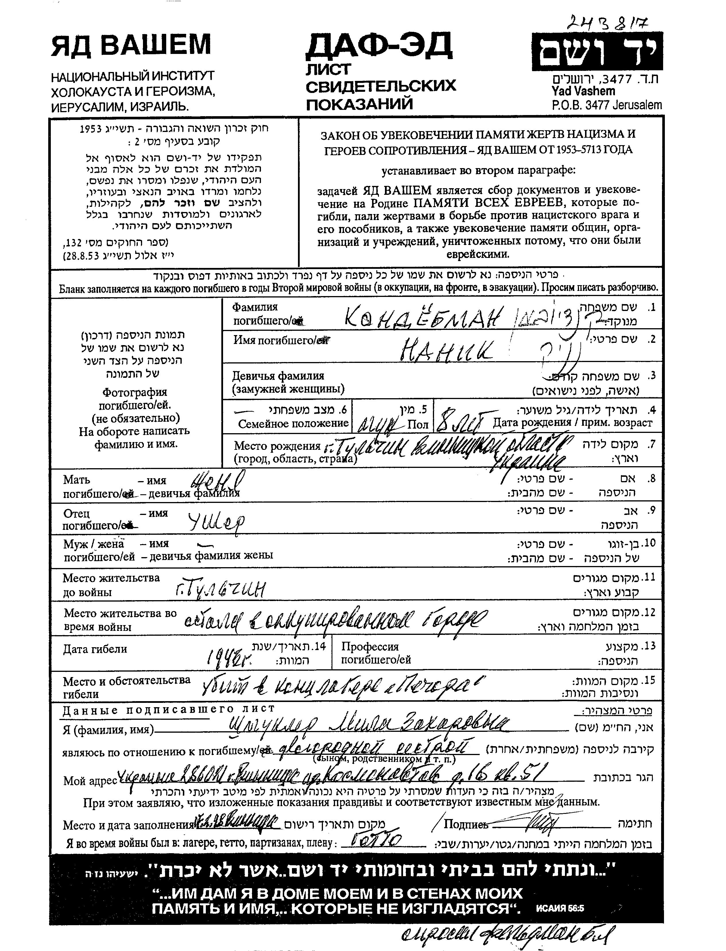 Kandyobman Nanik 1935 Tulchin, Ukraine (USSR) Page of Testimony