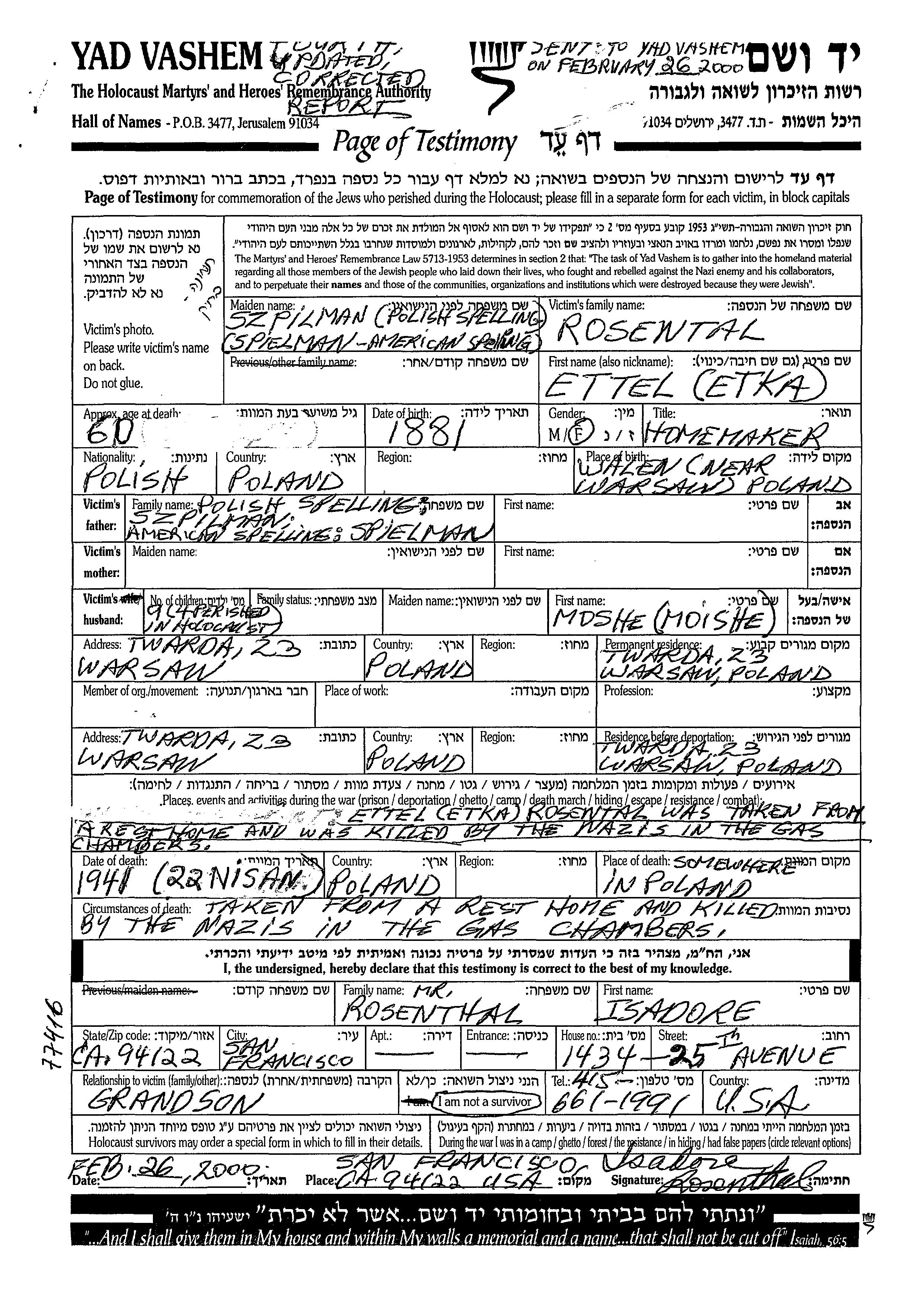Rosental Ettel 1881 Warszawa, Poland Page of Testimony