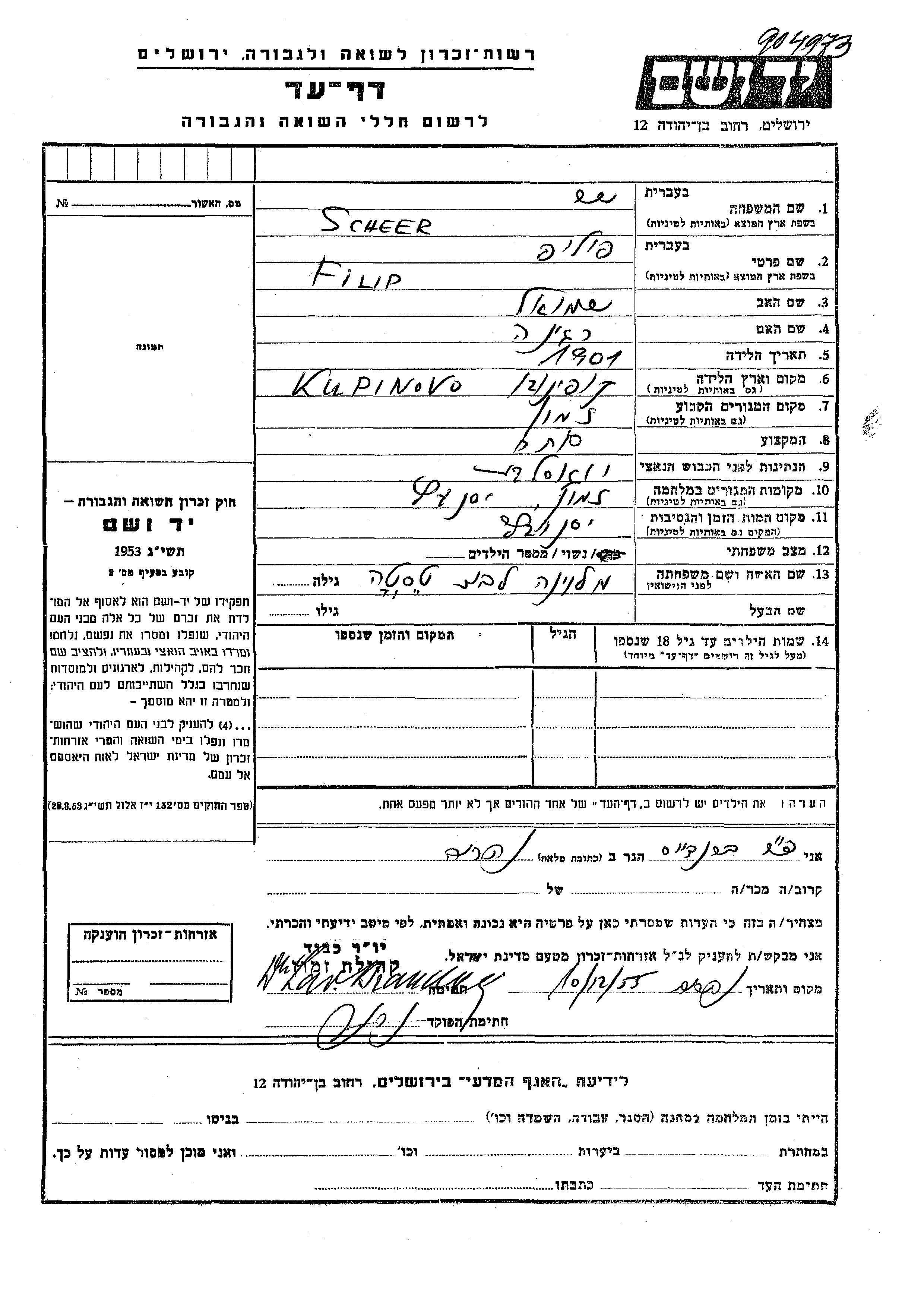 Scheer Filip 1901 Zemun, Yugoslavia Page of Testimony