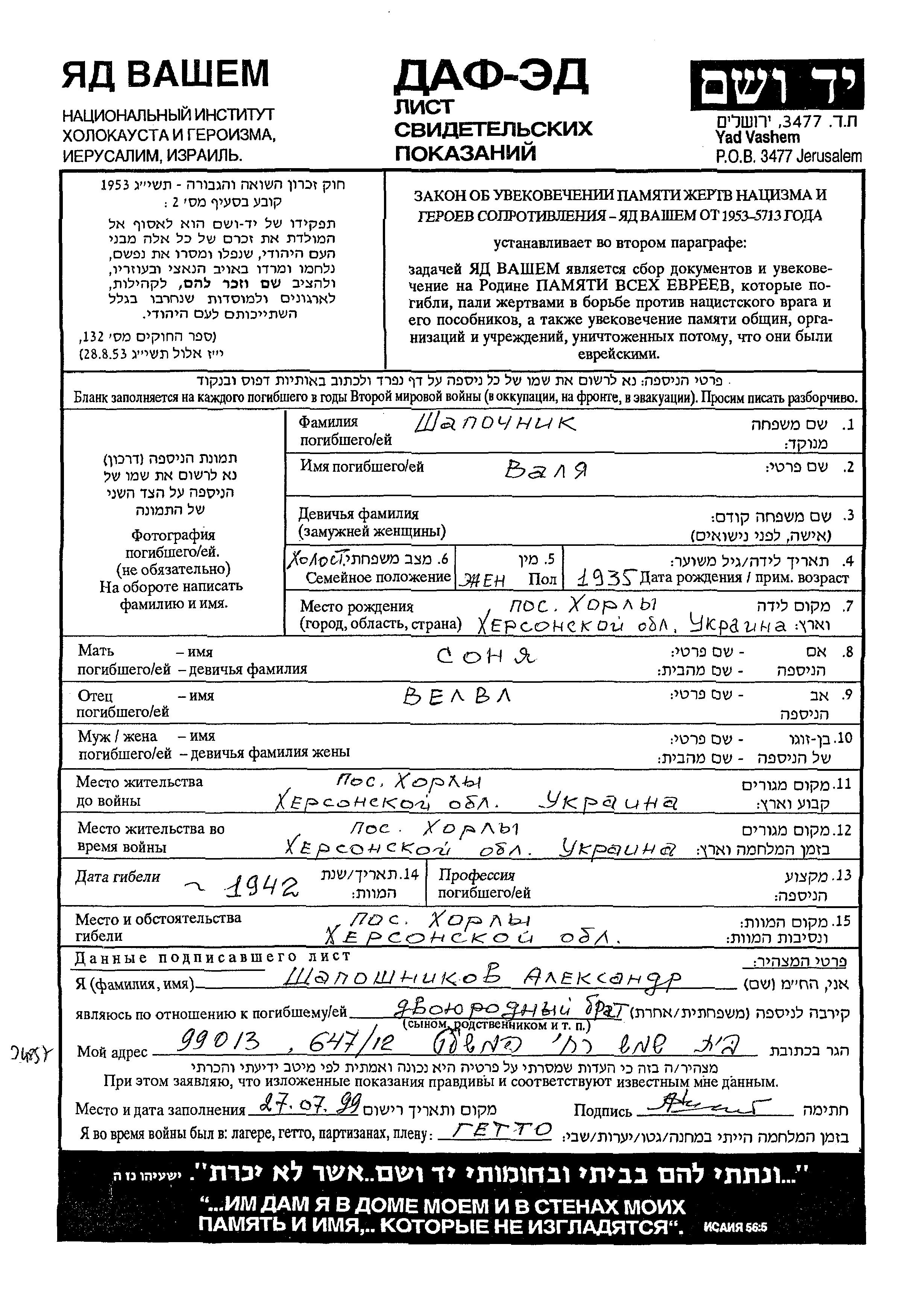 Alya Shapochnik was born in Khorli, Ukraine (USSR), 1935. Prior to WWII she lived in Khorli, Ukraine (USSR). Alya was murdered in the Shoah. Place of death: Port Khorly, Ukraine (USSR), 1942.