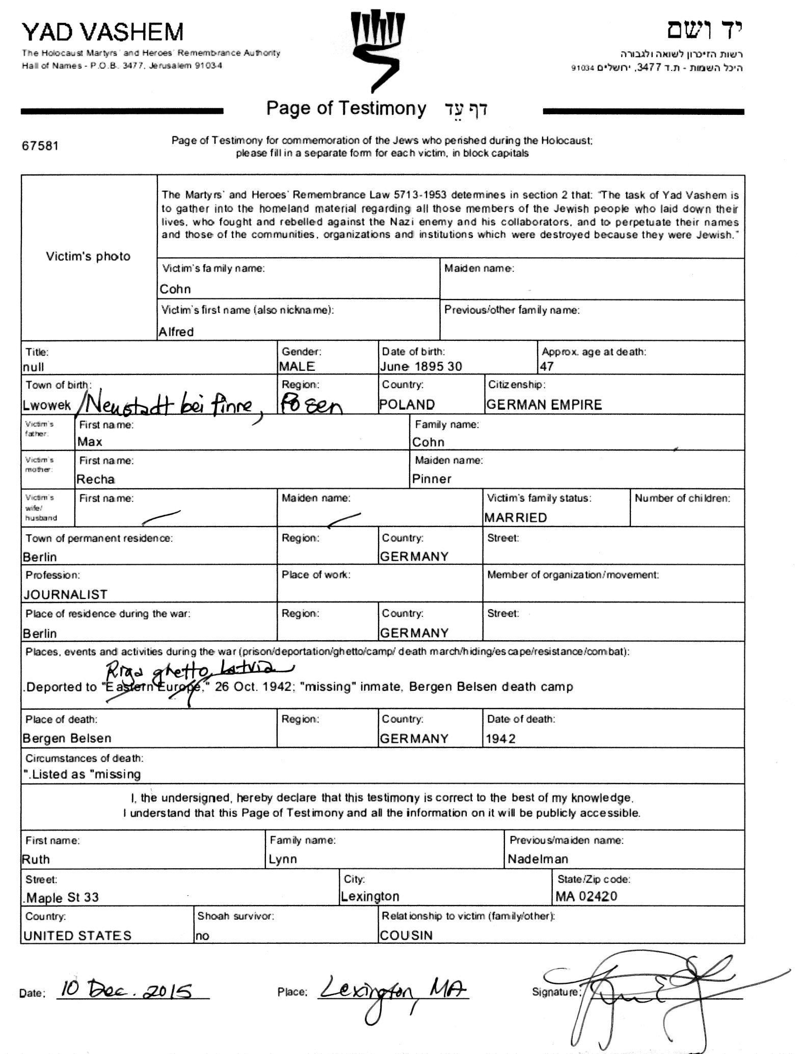 | Cohn | Alfred | 1895 | Berlin, Germany | Page of Testimony (digital signed) |