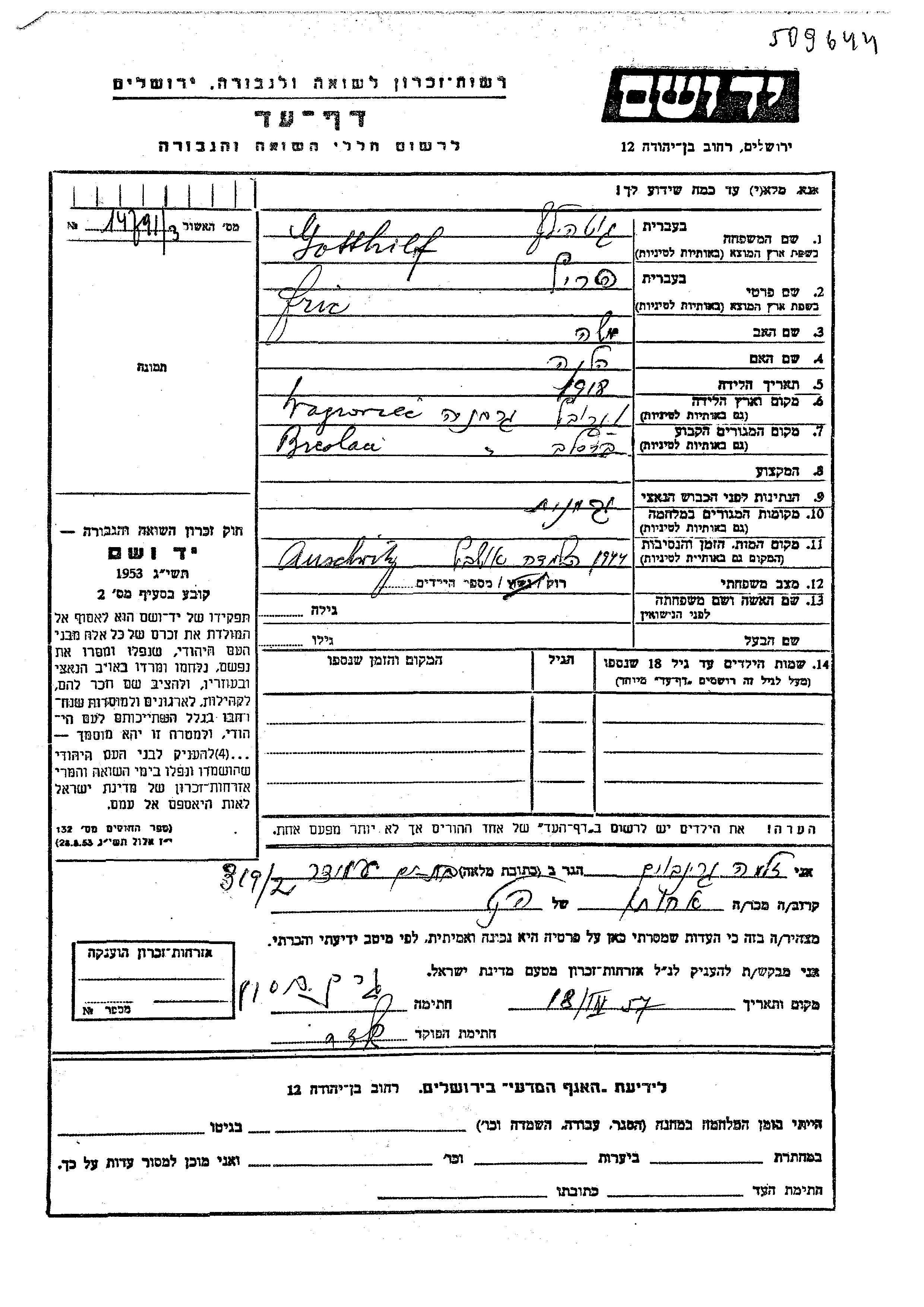 Fric Gotthilf was born in Wagrowiec, Poland, 1918 to Moshe and Helena. He was married. Prior to WWII he lived in Breslau, Germany. Fric was murdered in the Shoah. Place of death: Auschwitz, Poland.