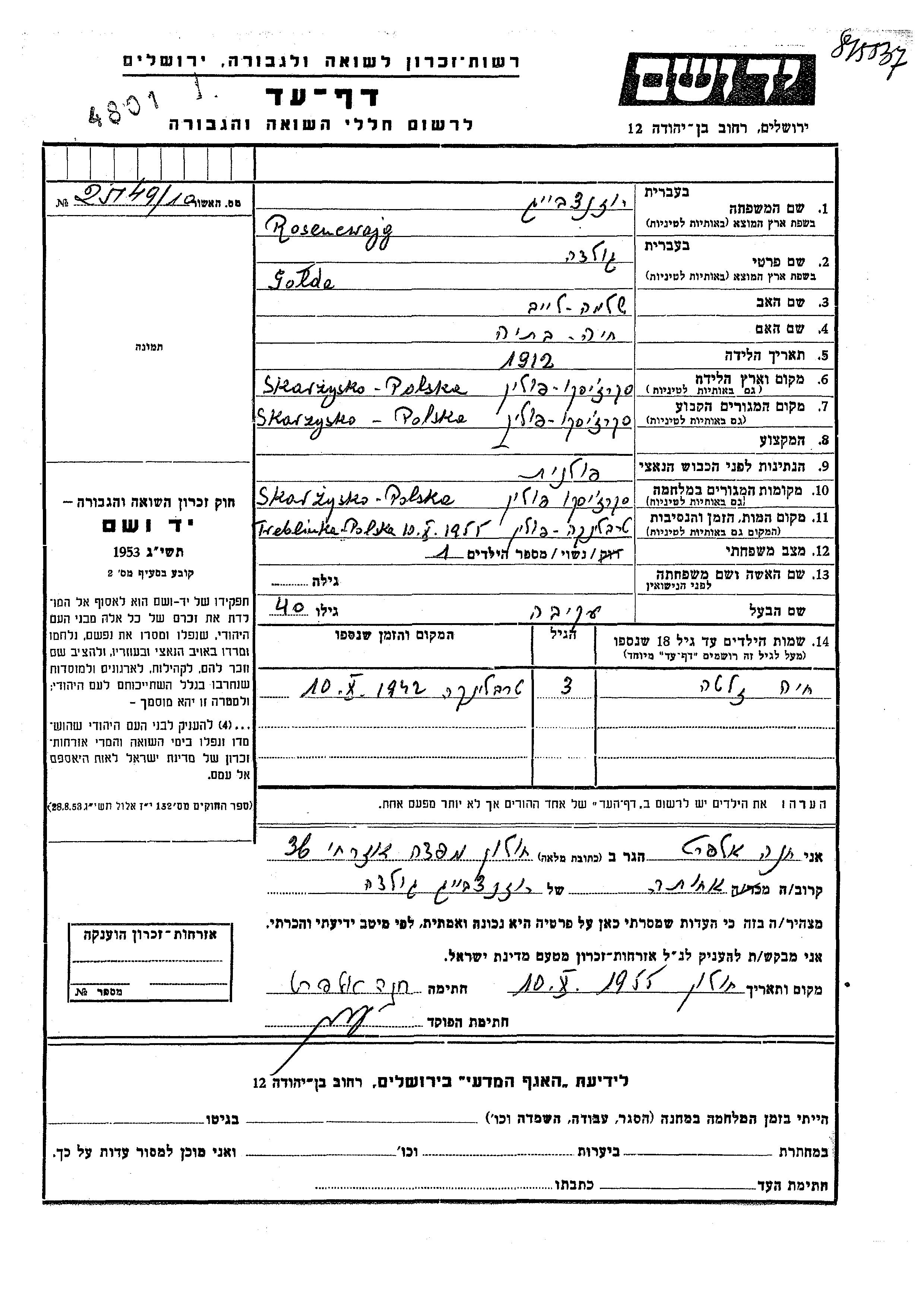 Rosencwejg Golda 1912 Skarzysko Kamienna, Poland Page of Testimony