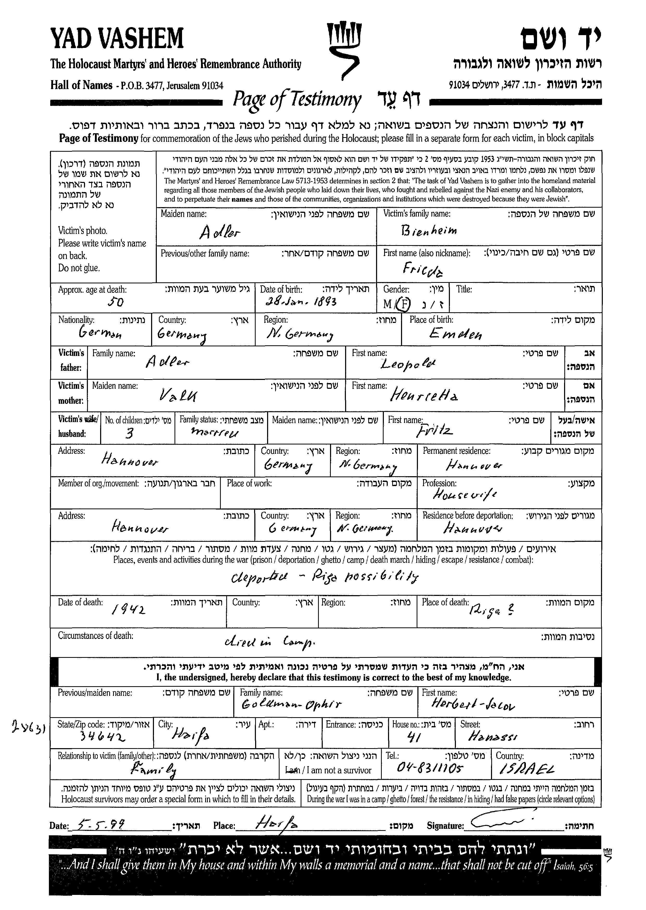 Frieda Binheim Bienheim nee Adler was born in Emden, Germany, 1893. She was a housewife. Prior to WWII she lived in Hannover, Germany. Frieda was murdered in the Shoah. Place of death: unknown, 1942.