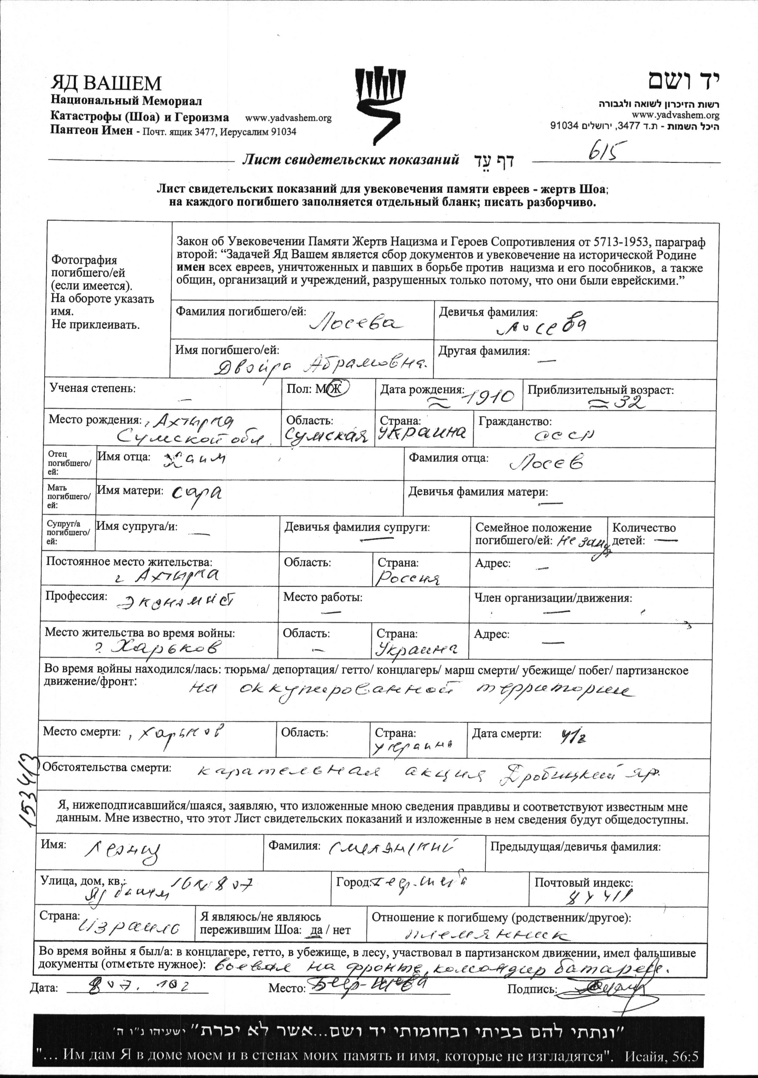 Dvoyra Loseva was born in Akhtyrka, Ukraine (USSR), 1910. She was an economist. Prior to WWII she lived in Akhtyrka, Ukraine (USSR). Dvoyra was murdered in the Shoah. Place of death: Drobitskiy Yar, Murder Site, 1941.