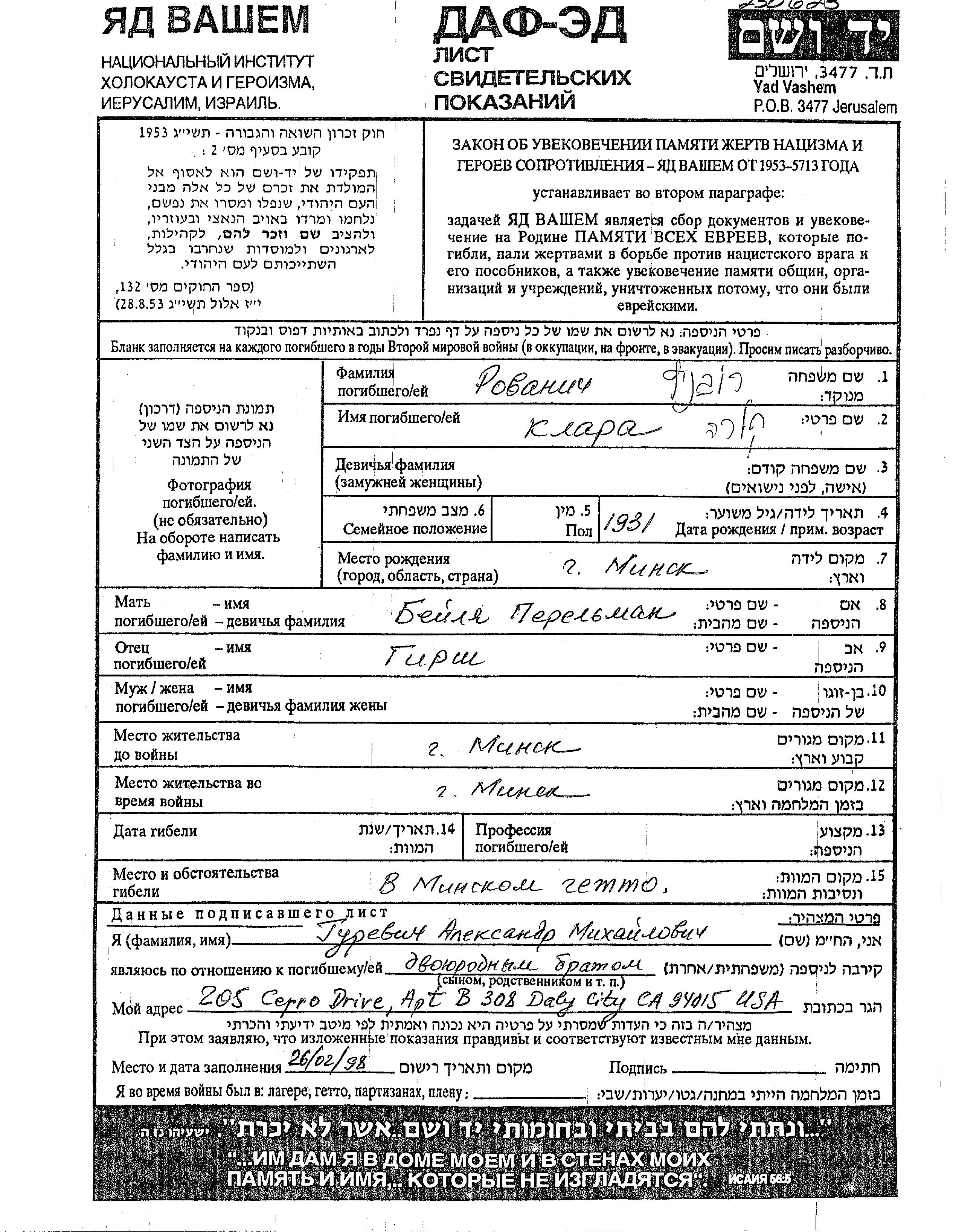 Rovanich Klara 1931 Minsk, Belorussia (USSR) Page of Testimony