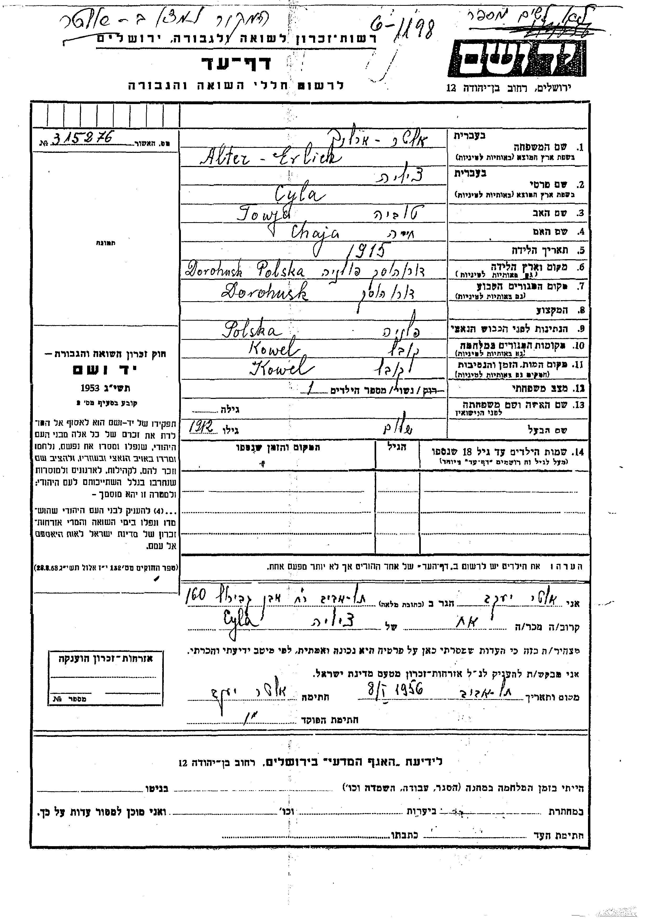 Erlich Cyla 1915 Dorohusk, Poland Page of Testimony