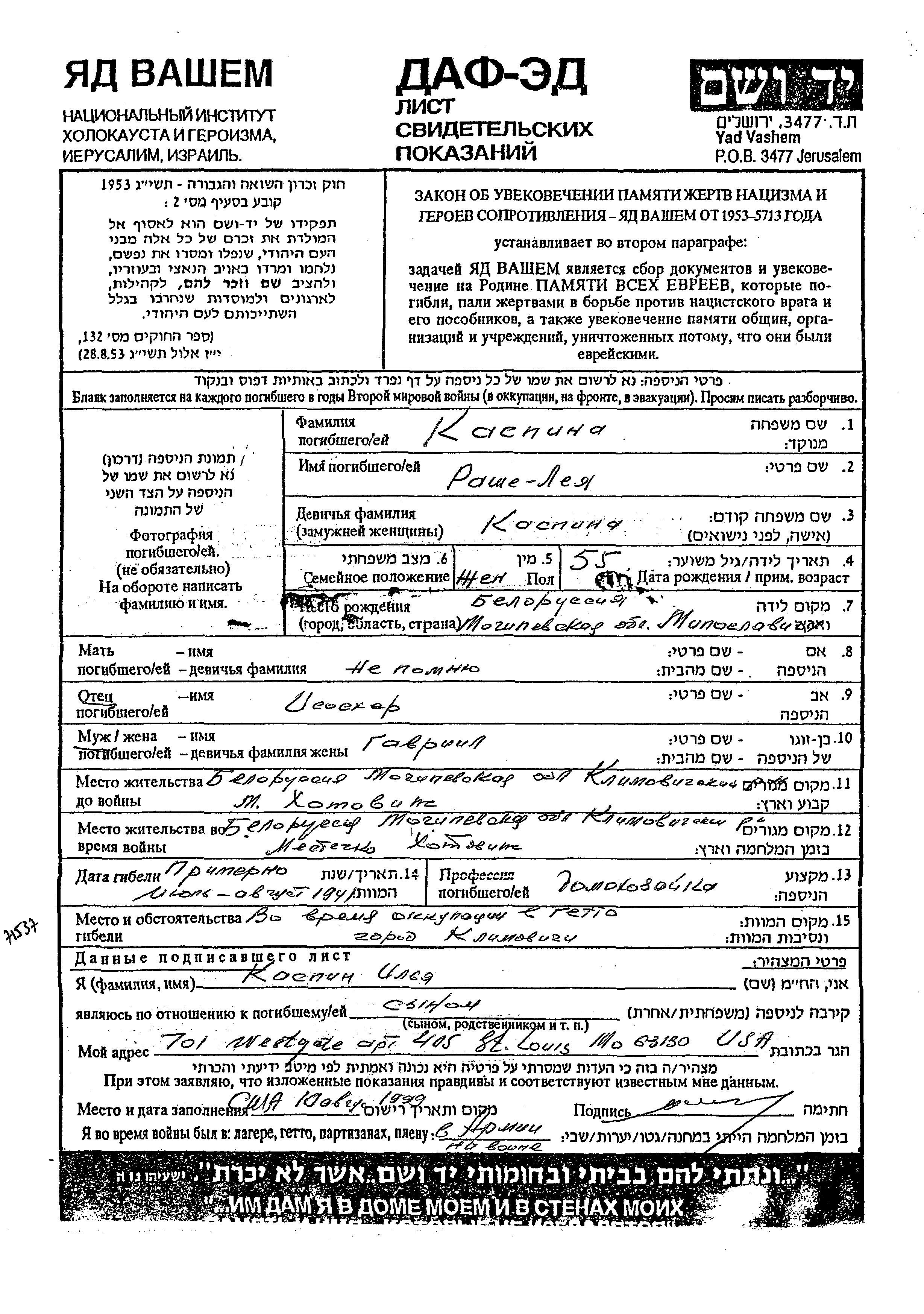 Rashe Leya Kaspin was born in Miloslavichi, Belorussia (USSR). She was a housewife. Prior to WWII she lived in Khotovizh, Belorussia (USSR). Rashe Leya was murdered in the Shoah. Place of death: Klimovichi, Belorussia (USSR), 01/07/1941.