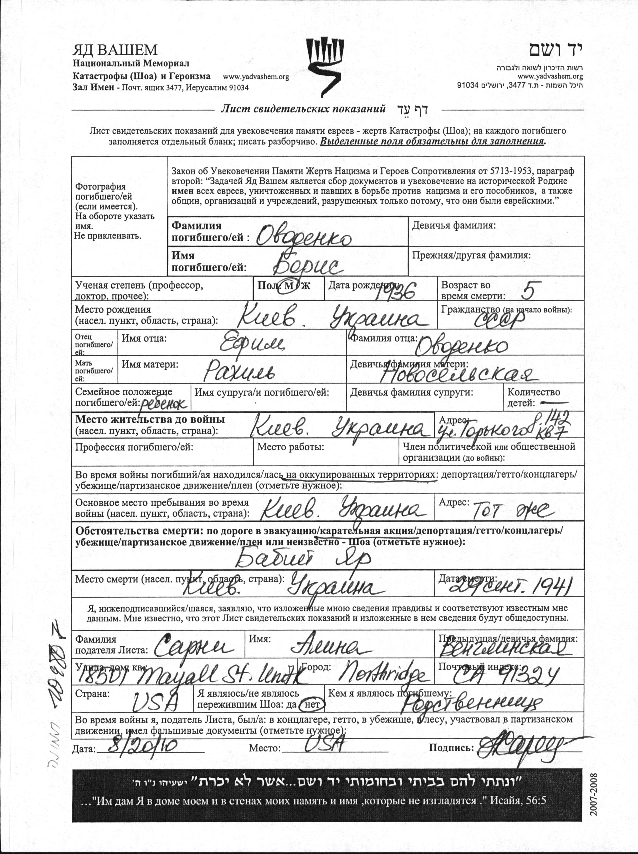 Ovodenko Boris 1936 Kiev, Ukraine (USSR) Page of Testimony (digital signed)