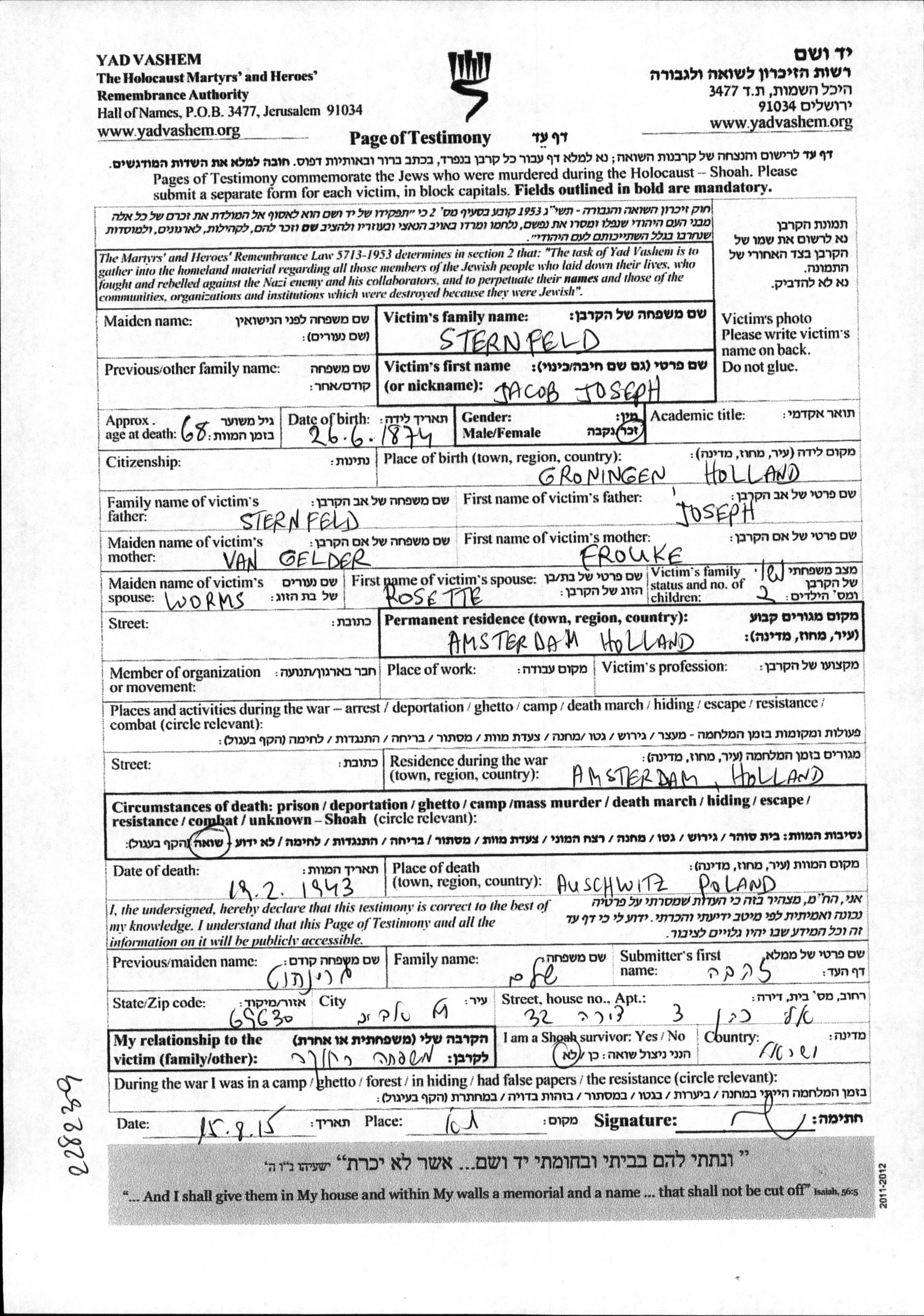 Jacob Joseph Sternfeld was born in Groningen, The Netherlands, 1874. Prior to WWII he lived in Amsterdam, The Netherlands.