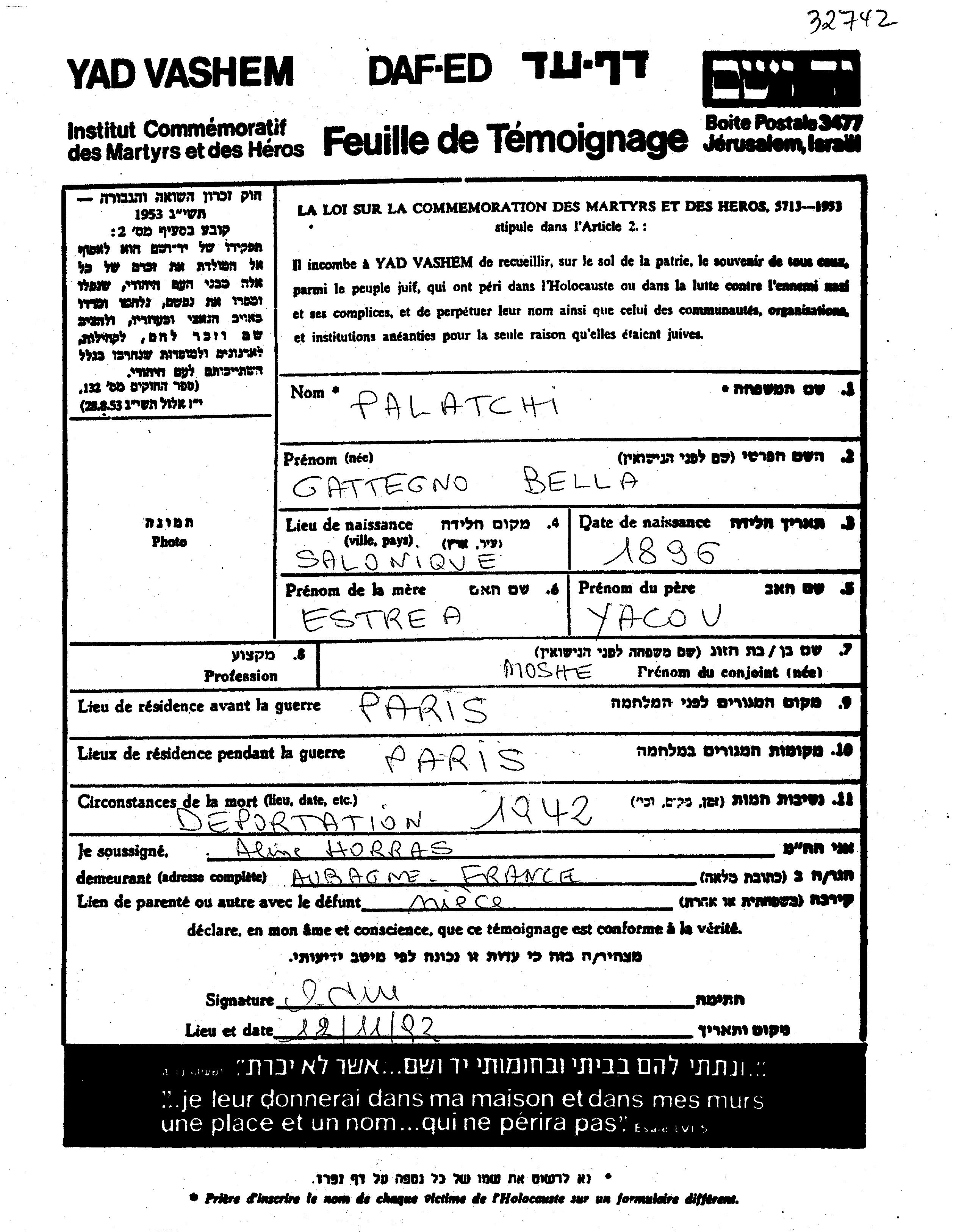 Palatchi Bella 1896 Paris, France Page of Testimony