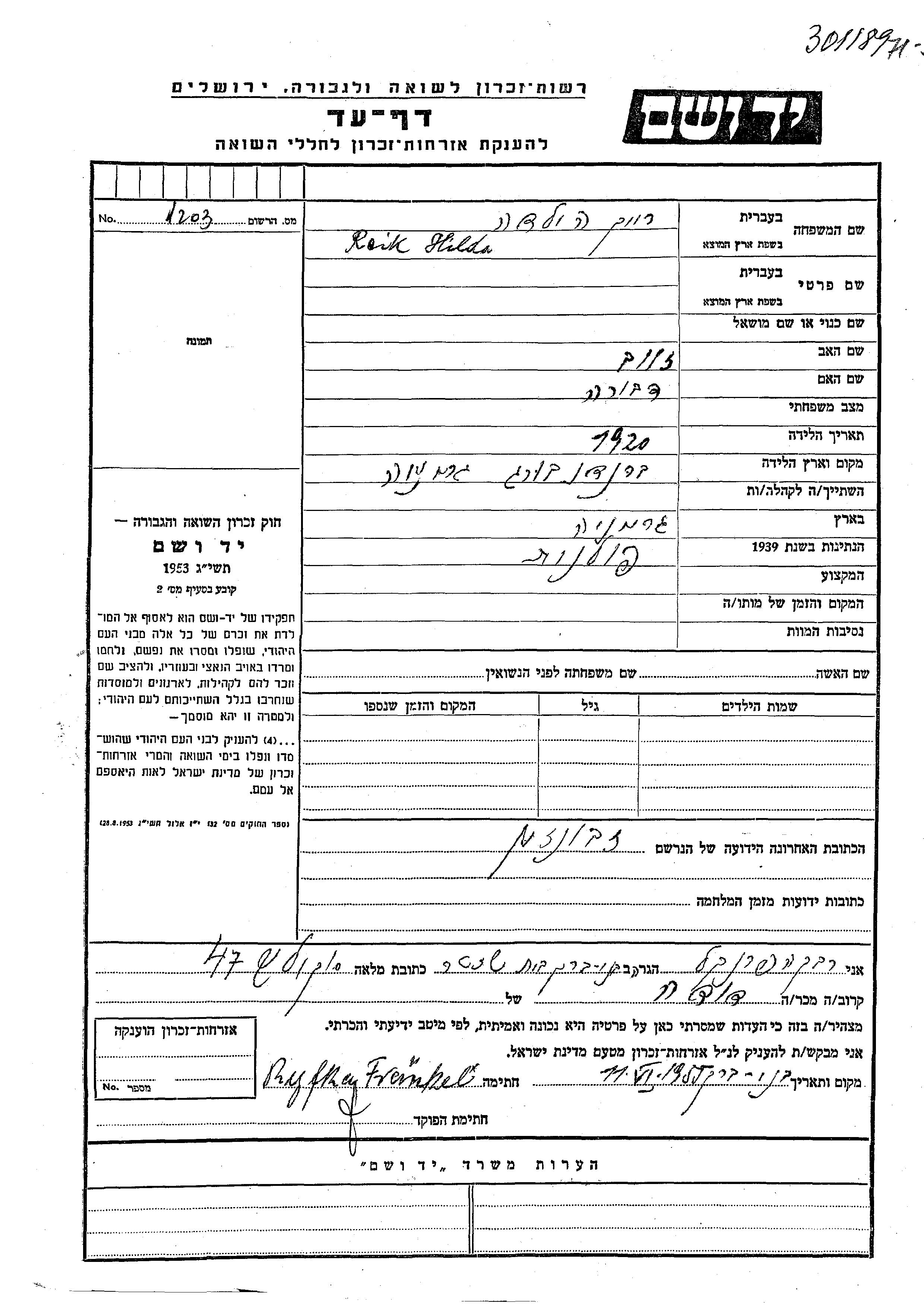 Raik Reikh Hilda 1920 Zbaszyn, Poland Page of Testimony