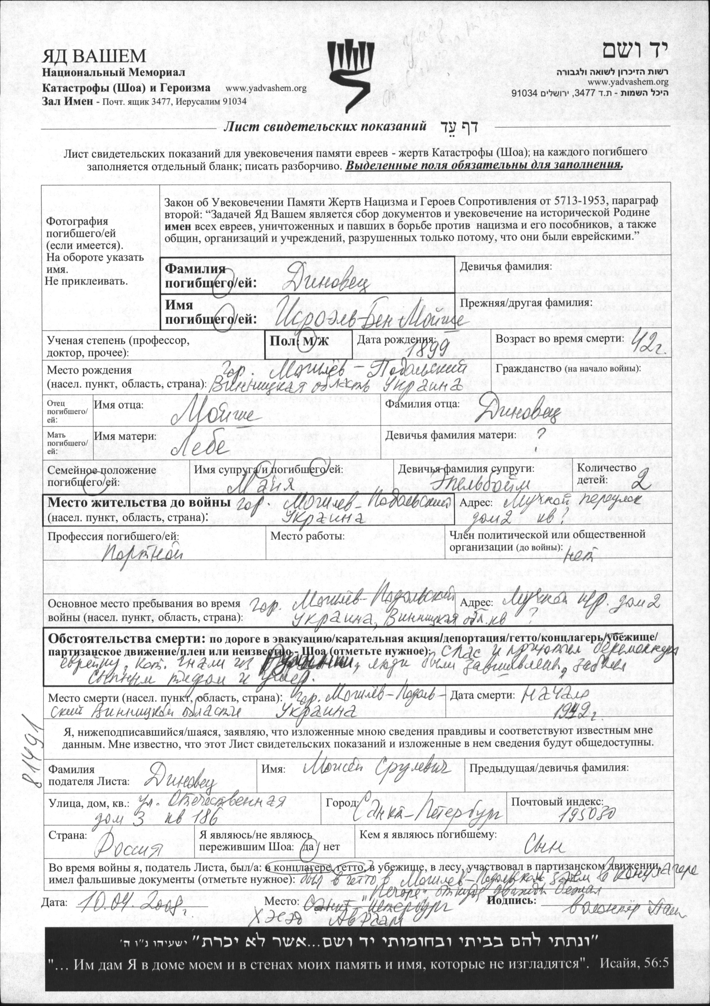 Dinovetz Isroel 1899 Mogilev Podolski, Ukraine (USSR) Page of Testimony