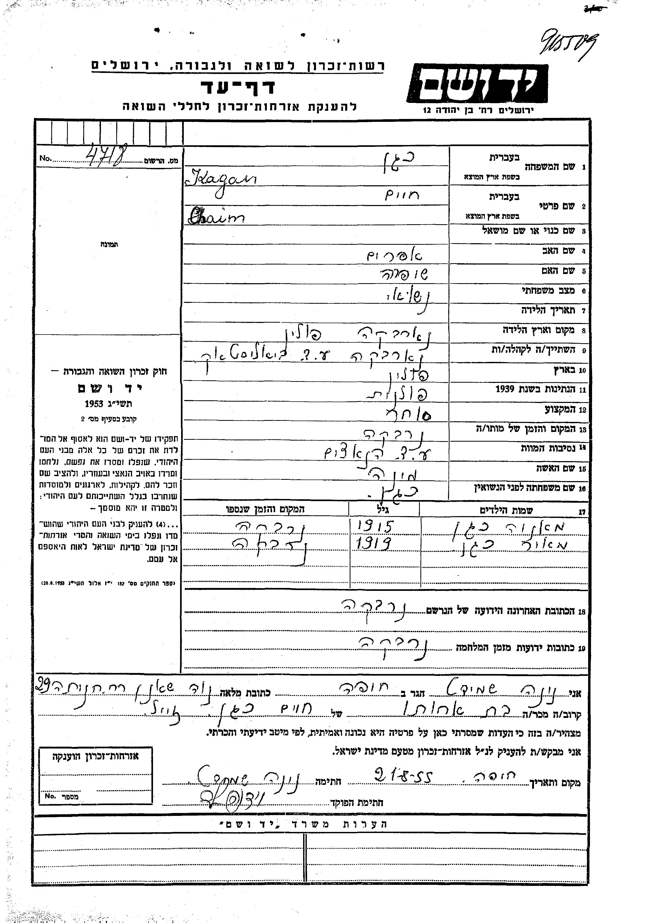Kagan Chaim Narewka Mala, Poland Page of Testimony