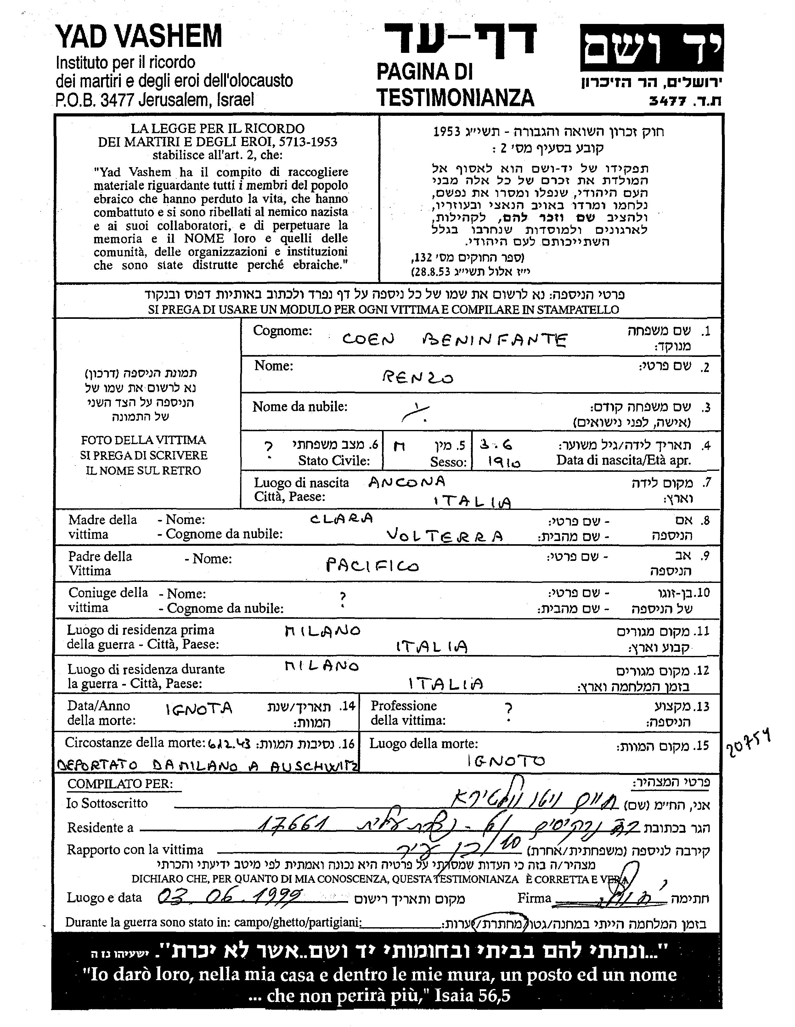 | Coen Beninfante | Renzo | 1910 | Milano, Italy | Page of Testimony |