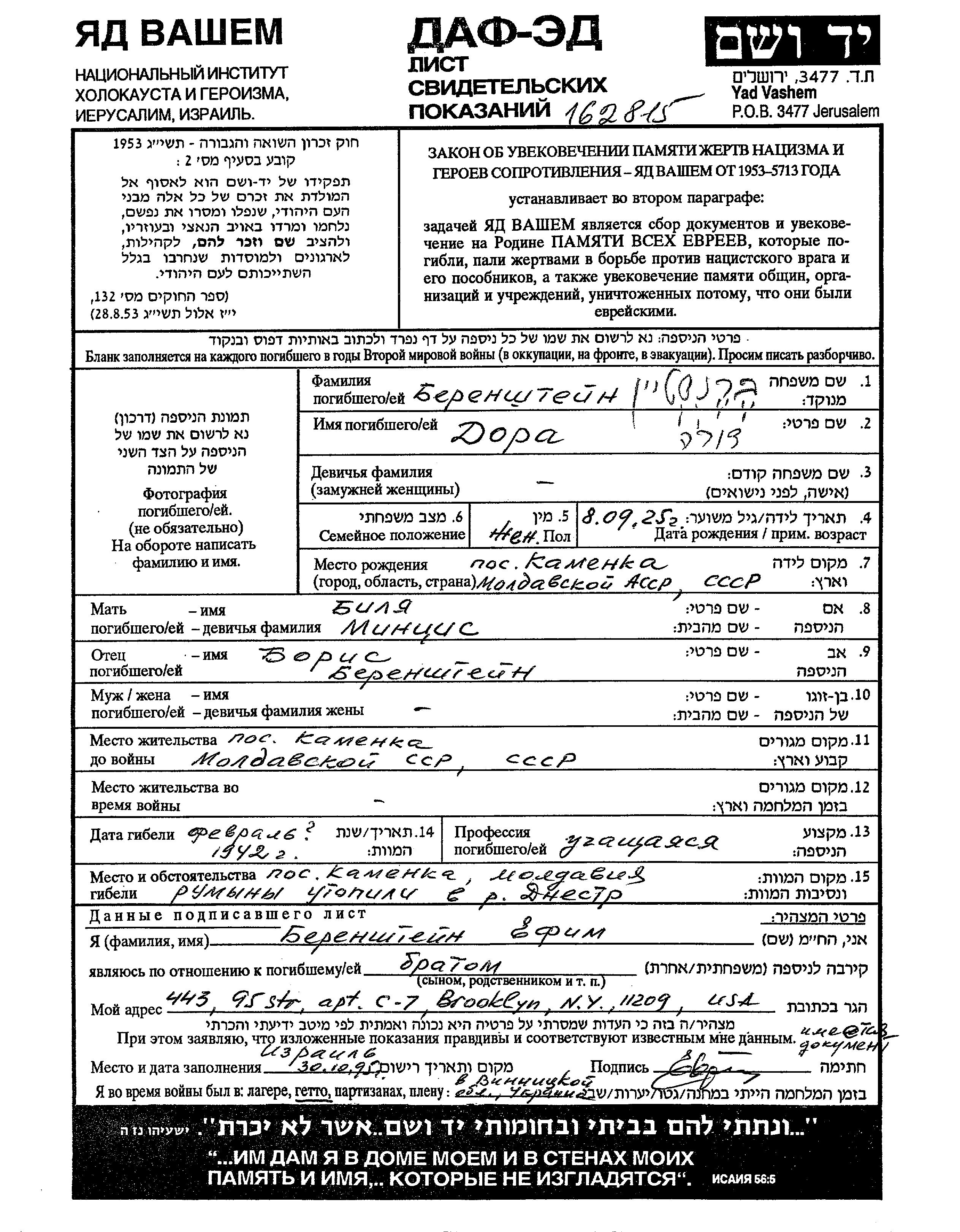 Dora Berenshtein Branshtein was born, 1925. She was a pupil. Prior to WWII she lived in Kamenka Moldavskaya, Ukraine (USSR). Dora was murdered in the Shoah. Place of death: unknown, 1942.
