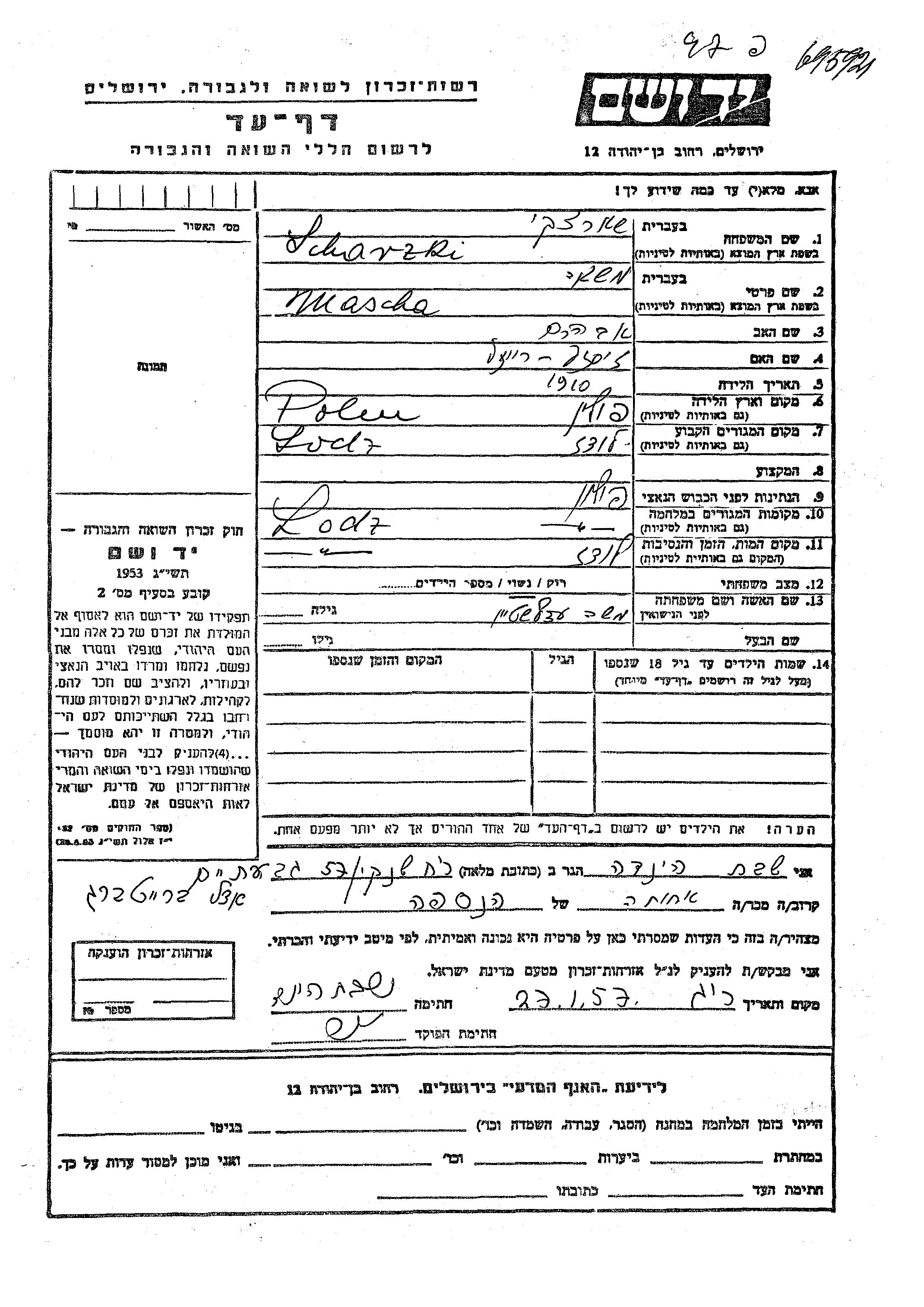 Mascha Scharzki nee Edelshtein was born in Poland, 1910 to Avraham and Reizl. She was married to Moshe. Prior to WWII she lived in Lodz, Poland. During the war she was in Lodz, Poland.