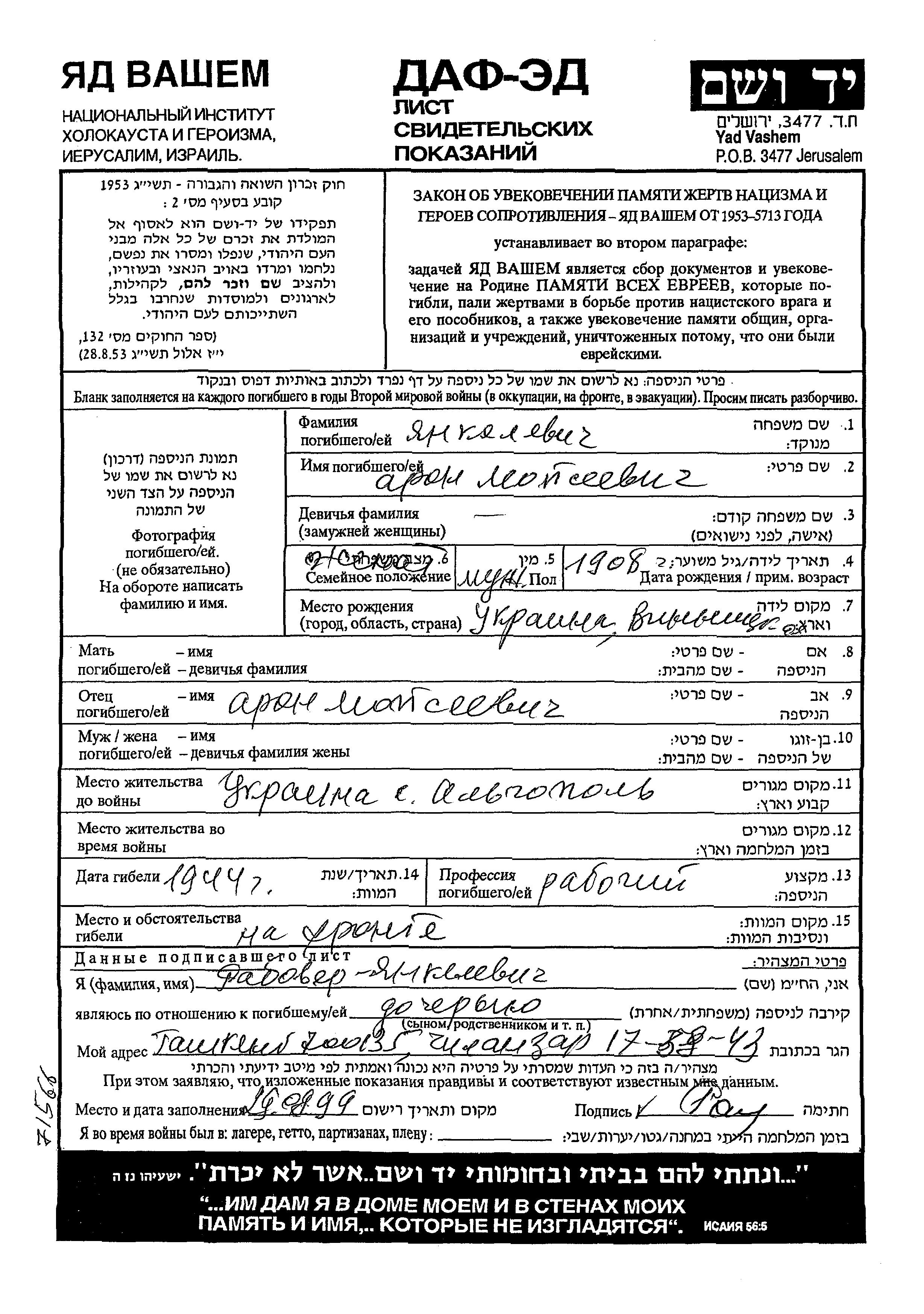 Aron Yankelevich was born in Vinnitsa, Ukraine (USSR), 1908. He was a worker. Prior to WWII he lived in Olgopol, Ukraine (USSR).