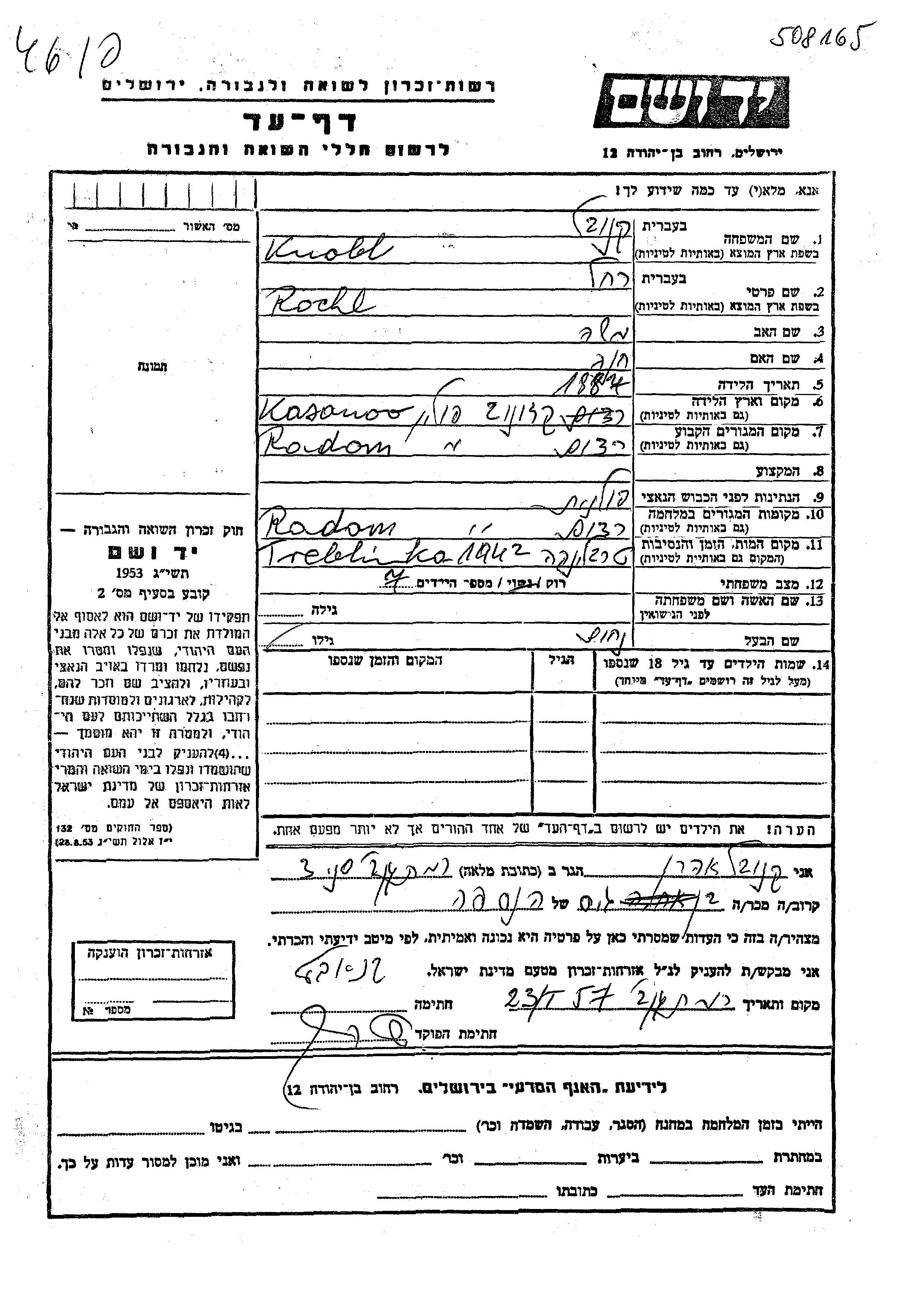 Knobl Rochl 1887 Radom, Poland Page of Testimony