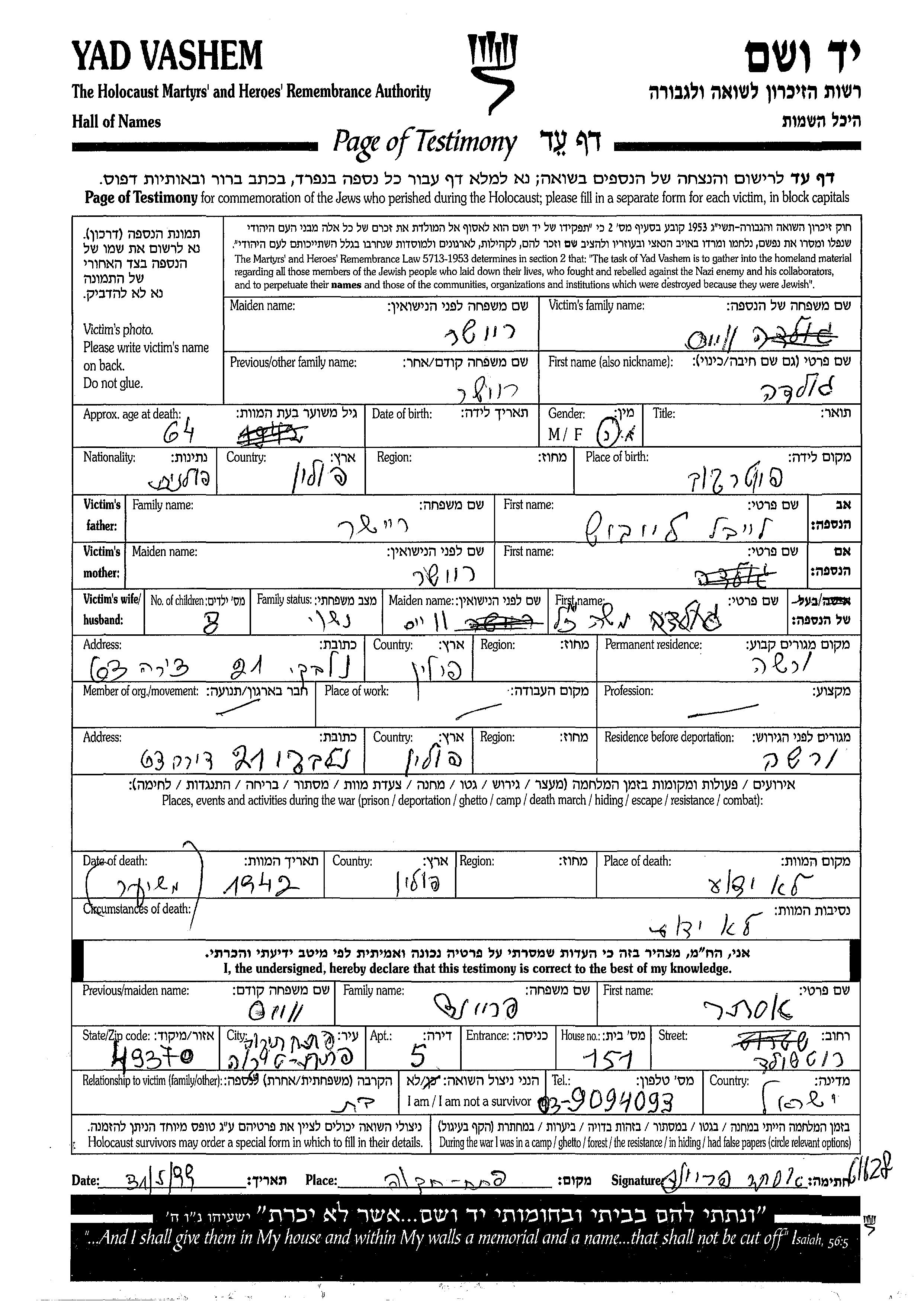 Golda Weiss nee Reisher was born in Piotrkow, Poland. She was a housewife. Prior to WWII she lived in Warszawa, Poland. Golda was murdered in the Shoah. Place of death: Poland, 1942.