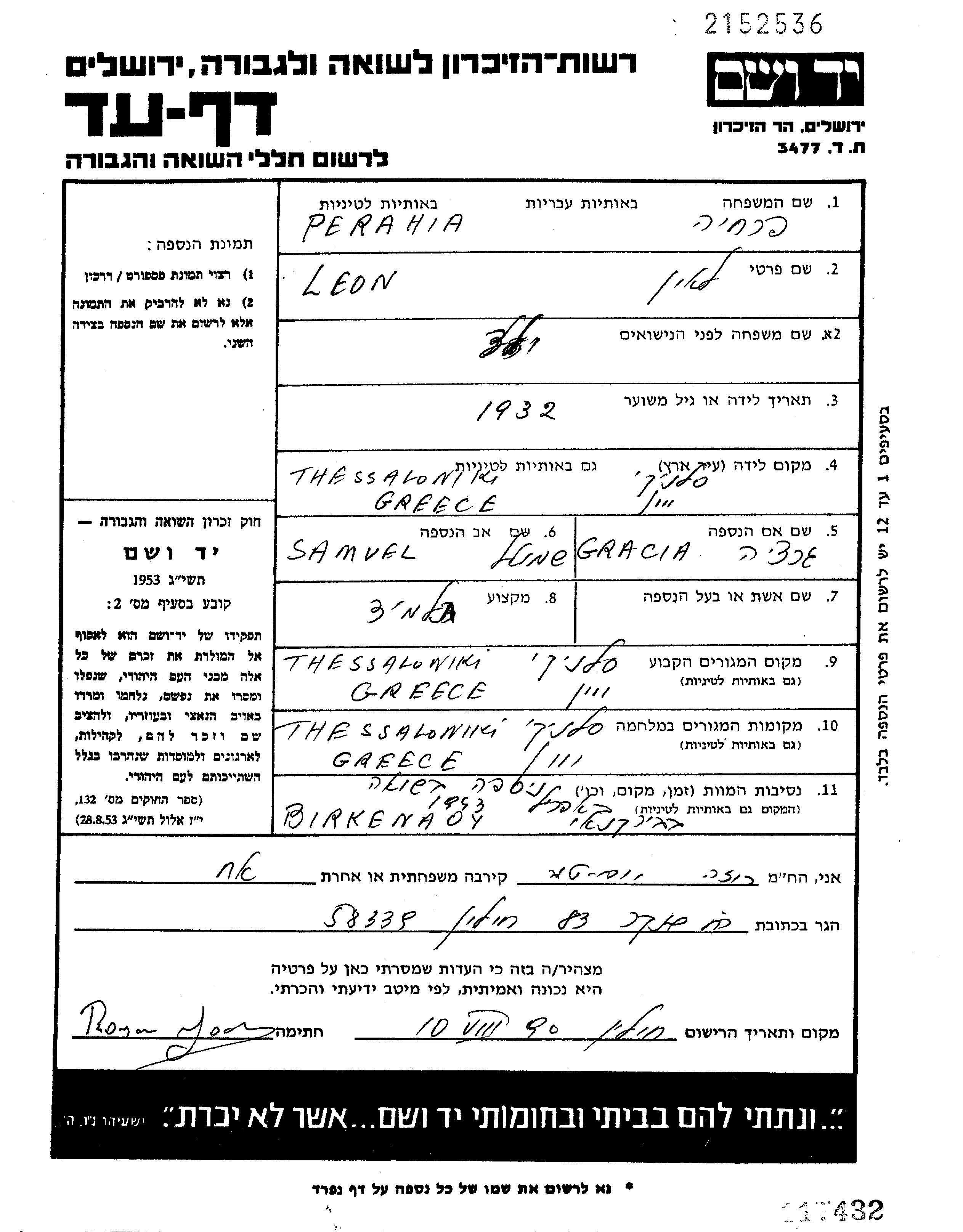 Perahia Leon 1932 Thessaloniki, Greece Page of Testimony