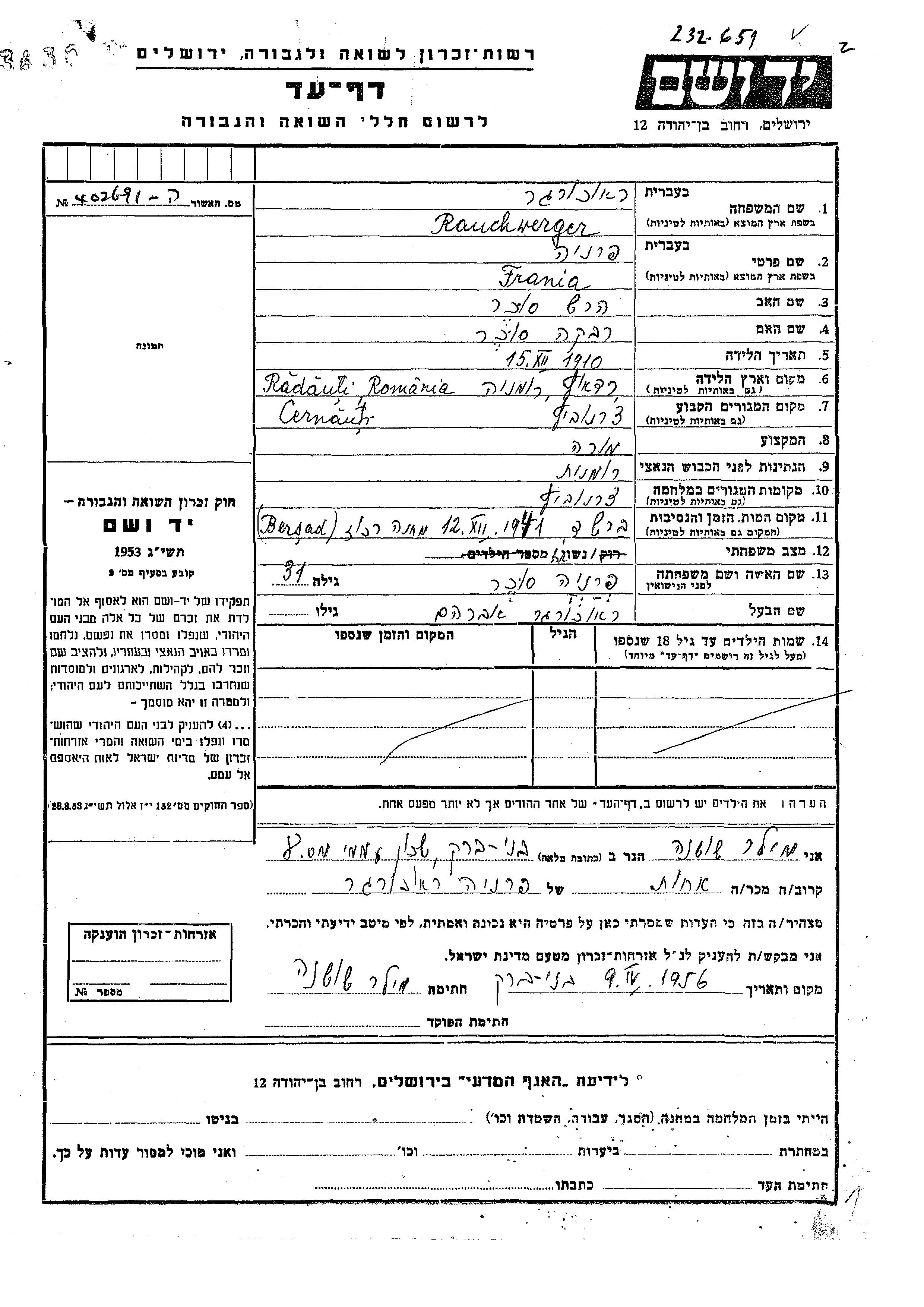 Frania Fani Rauchwerger nee Sukher was born in Radauti, Romania, 1910. She was a teacher. Prior to WWII she lived in Czernowitz, Romania. Frania Fani was murdered in the Shoah. Place of death: unknown, 1941.