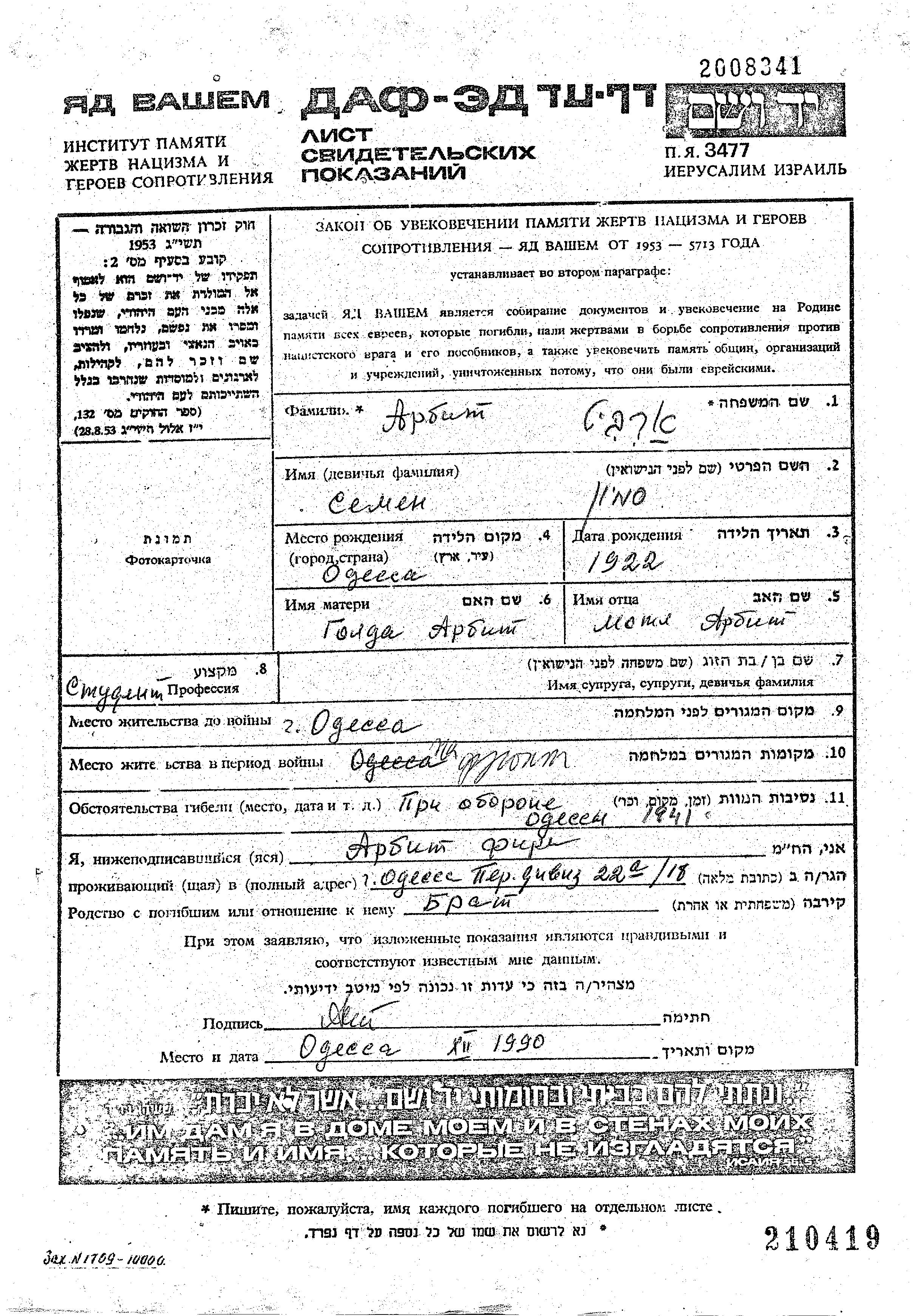 Arbit Semion 1922 Odessa, Ukraine (USSR) Page of Testimony
