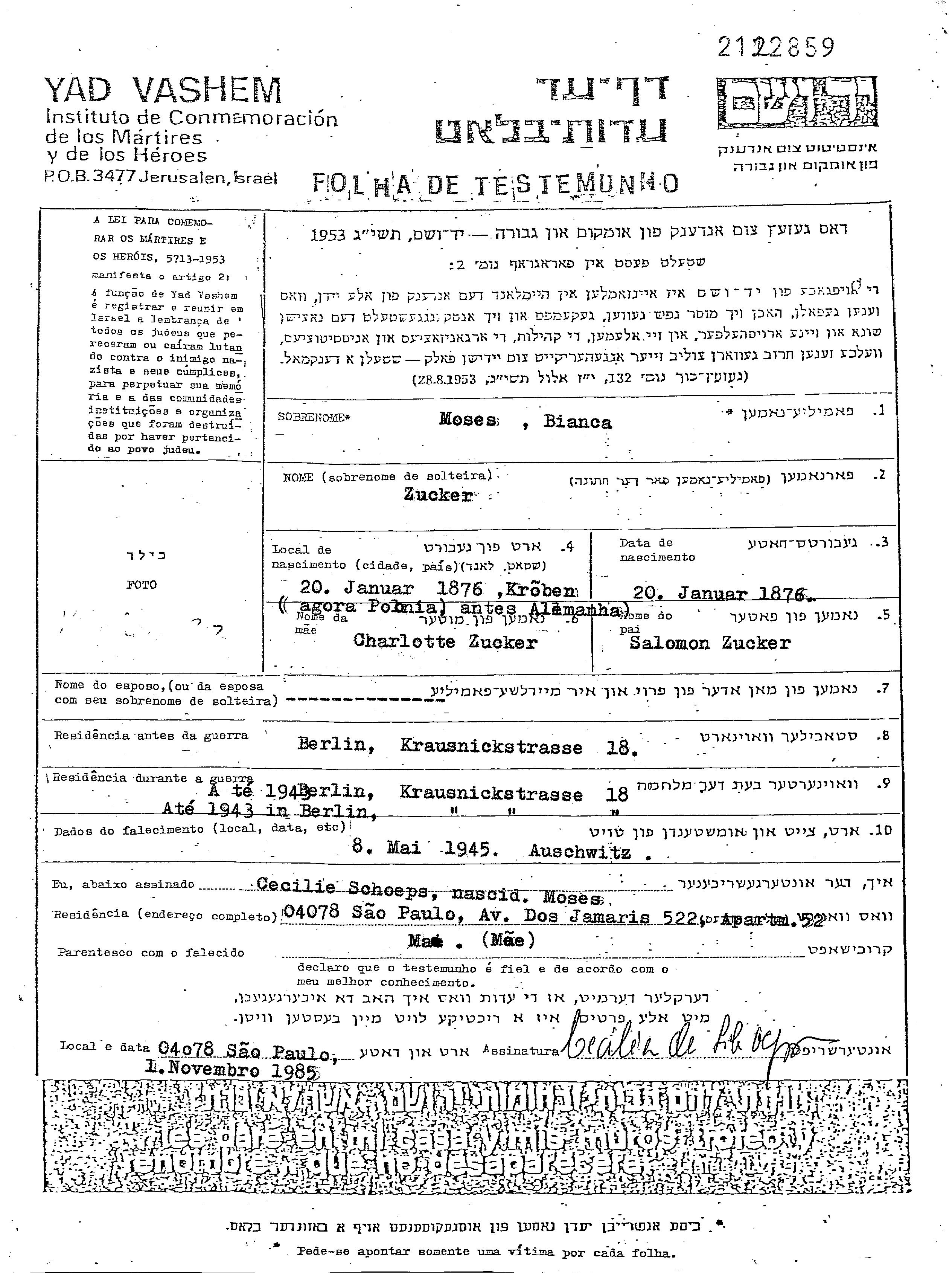 | Moses | Bianca | 1876 | Berlin, Germany | Page of Testimony |