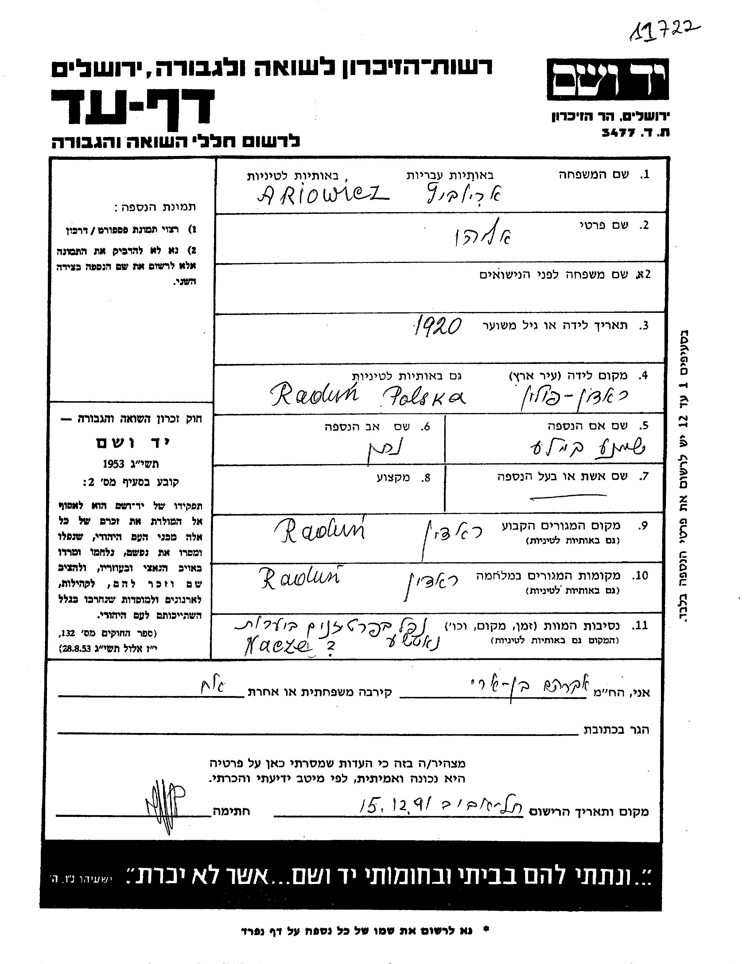 Ariowicz Eliahu 1920 Radun, Poland Page of Testimony