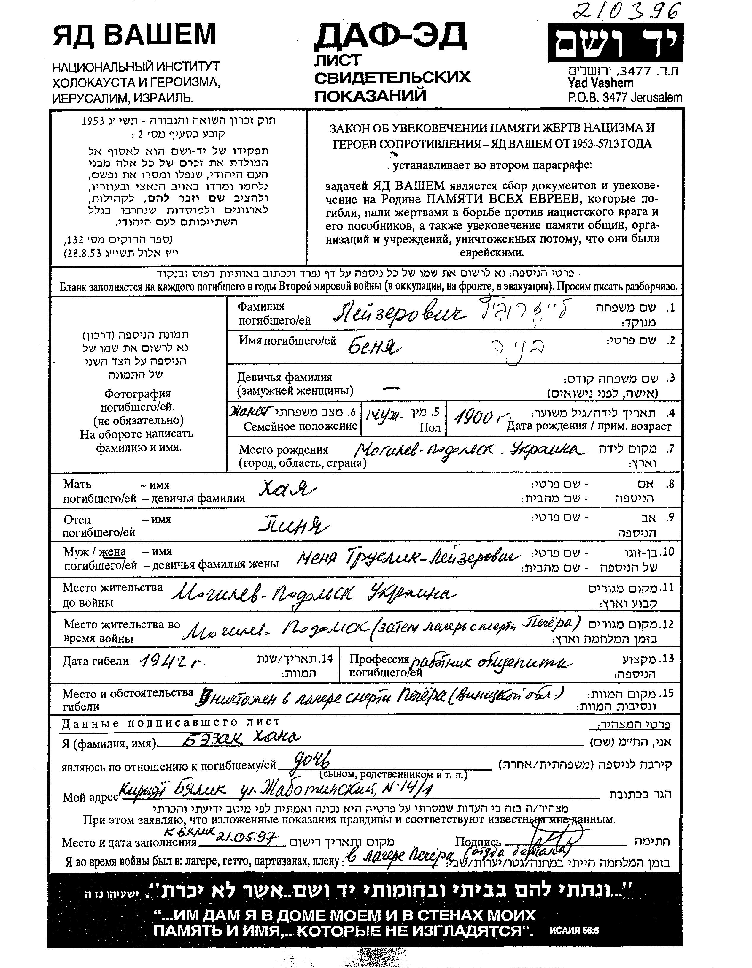 Leizerovich Benya 1900 Mogilev Podolskiy, Ukraine (USSR) Page of Testimony