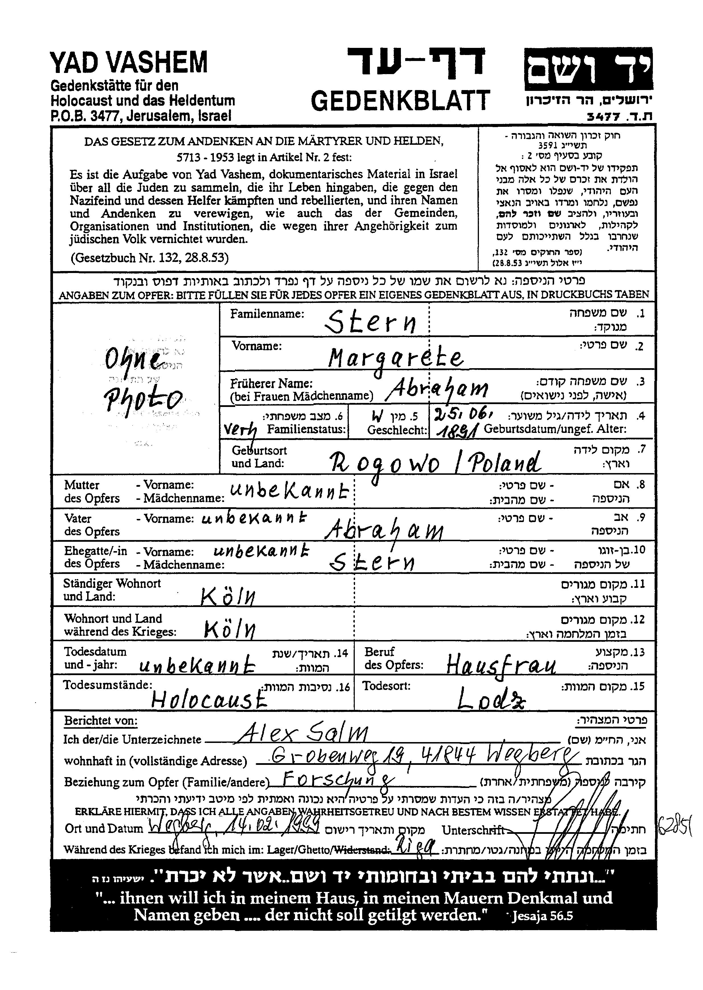 Margarethe Stern nee Abraham was born in Rogowo, Poland, 1891. She was a housewife. Prior to WWII she lived in Koeln, Germany. Margarethe was murdered in the Shoah. Place of death: unknown, 10/05/1942.
