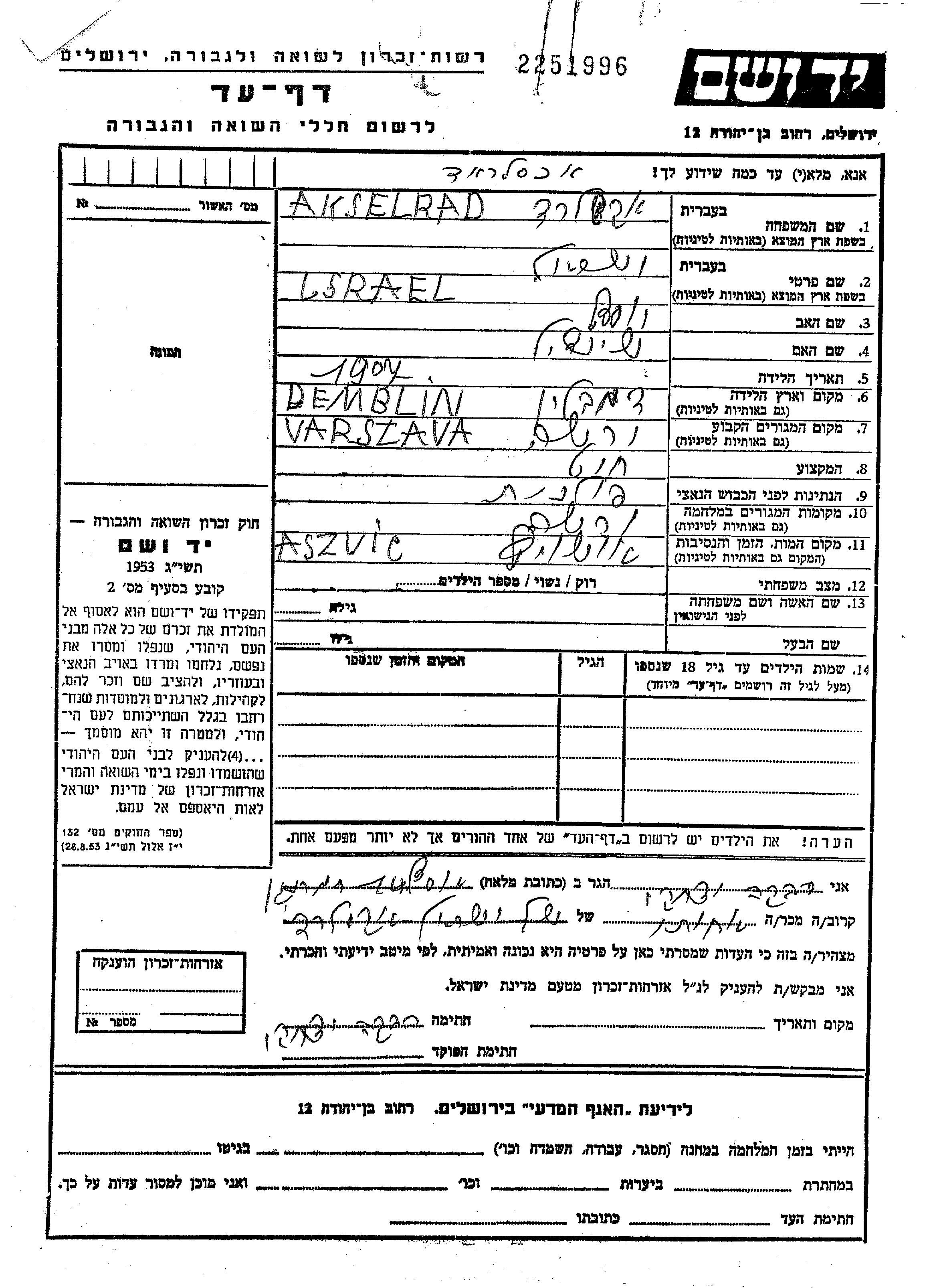 | Akselrad | Israel | 1907 | Warszawa, Poland | Page of Testimony |