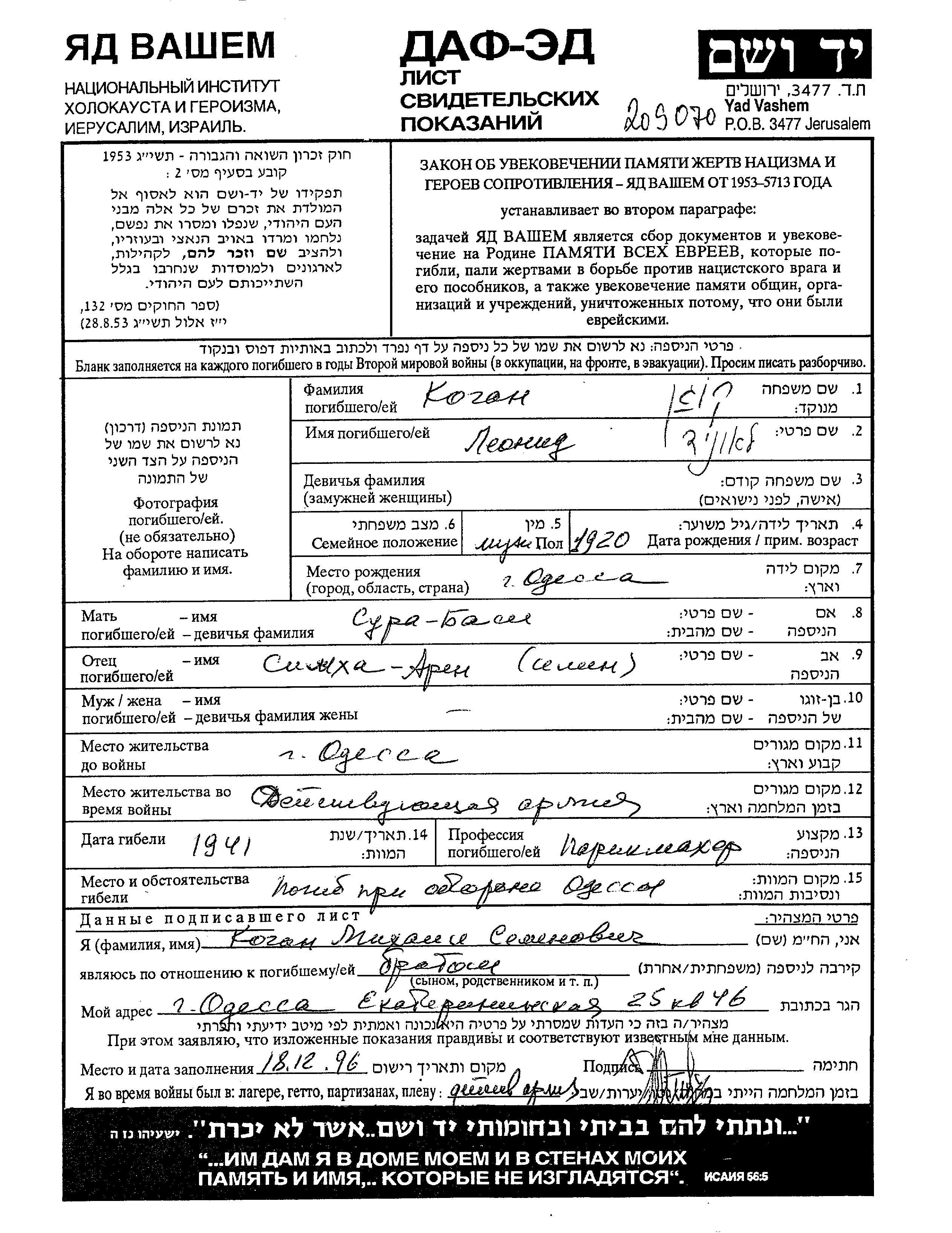 Kogan Leonid 1920 Odessa, Ukraine (USSR) Page of Testimony