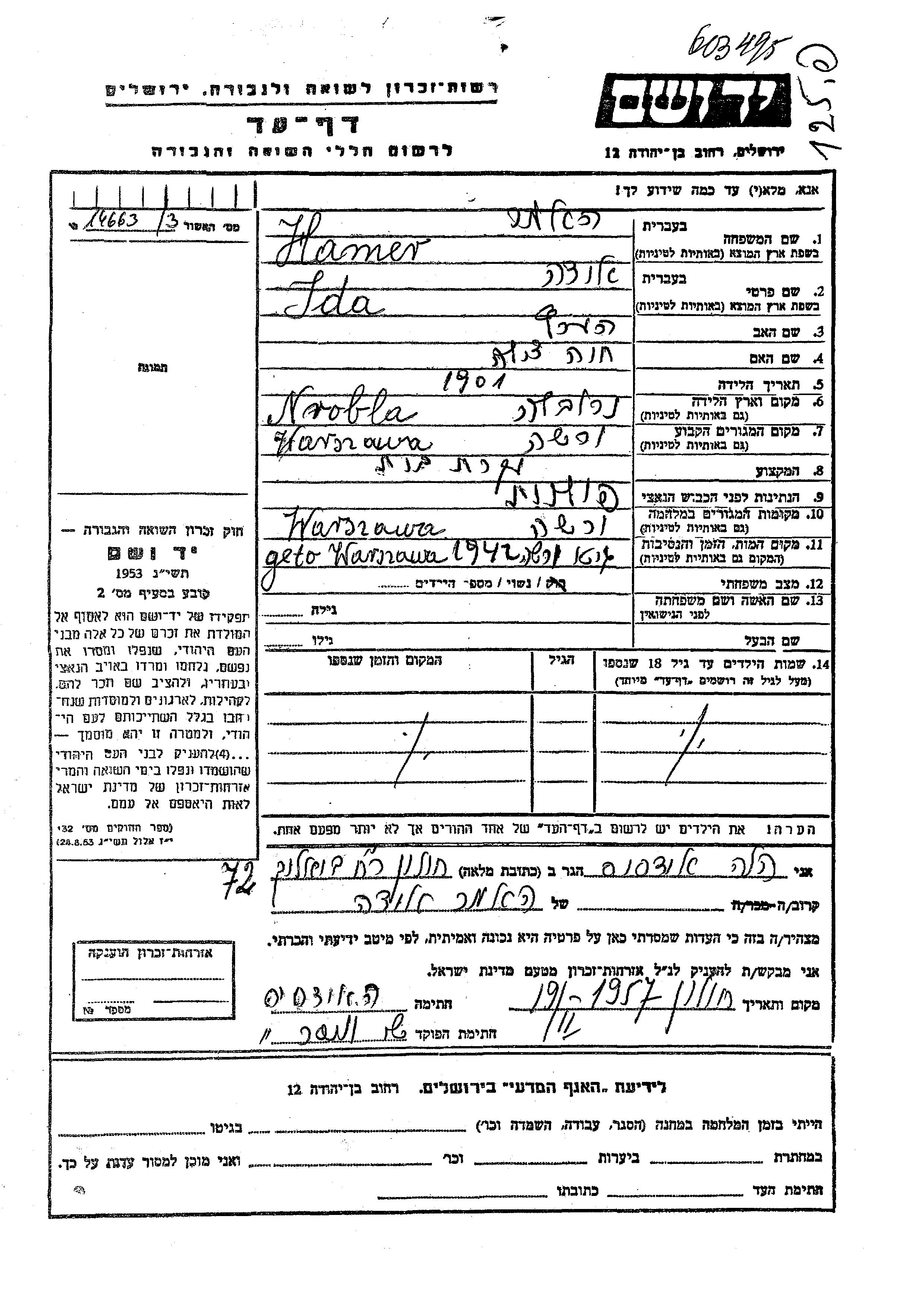 Hamer Ida 1901 Warszawa, Poland Page of Testimony
